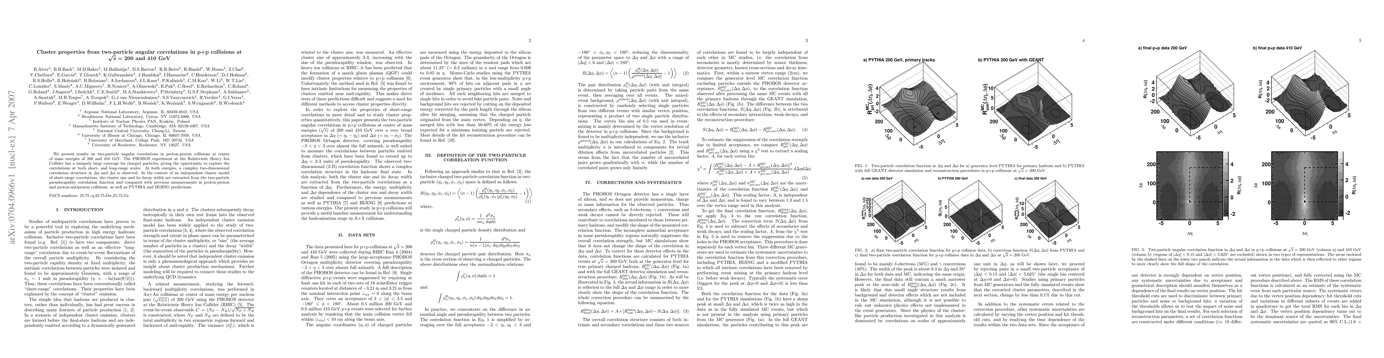 We present results on two-particle angular correlations in proton-proton collisions at center of mass energies of 200 and 410 GeV. The PHOBOS experiment at the Relativistic Heavy Ion Collider has a uniquely large coverage for charged particles, giving the opportunity to explore the correlations at both short- and long-range scales. At both energies, a complex two-dimensional correlation structure in $\Delta \eta$ and $\Delta \phi$ is observed. In the context of an independent cluster model of short-range correlations, the cluster size and its decay width are extracted from the two-particle pseudorapidity correlation function and compared with previous measurements in proton-proton and proton-antiproton collisions, as well as PYTHIA and HIJING predictions.