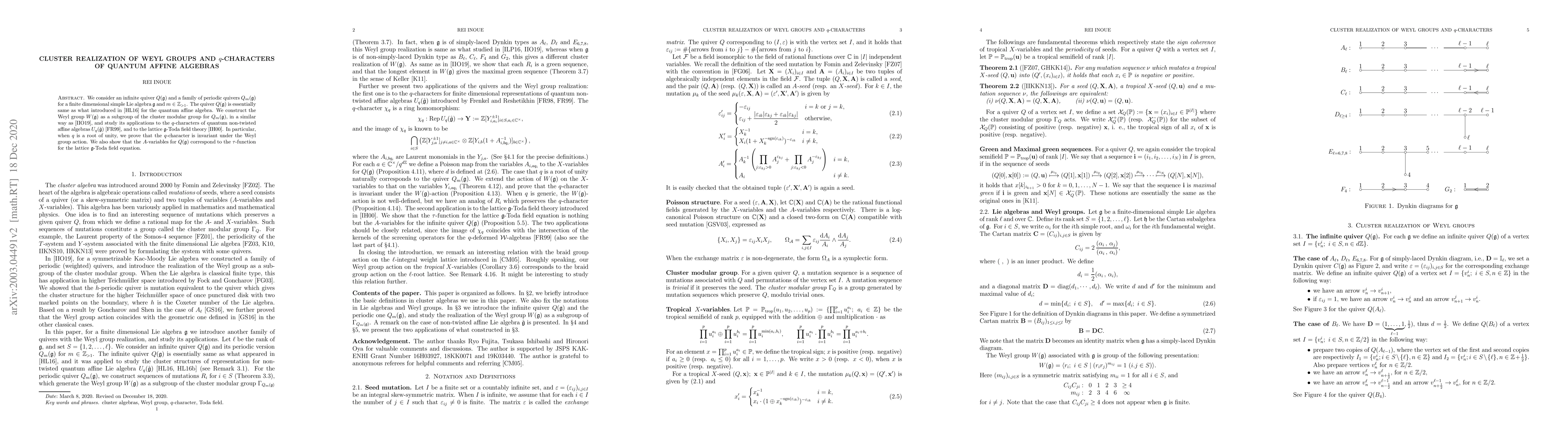 We consider an infinite quiver $Q(\mathfrak{g})$ and a family of periodic quivers $Q_m(\mathfrak{g})$ for a finite dimensional simple Lie algebra $\mathfrak{g}$ and $m \in \mathbb{Z}_{>1}$. The quiver $Q(\mathfrak{g})$ is essentially same as what introduced by Hernandez and Leclerc for the quantum affine algebra. We construct the Weyl group $W(\mathfrak{g})$ as a subgroup of the cluster modular group for $Q_m(\mathfrak{g})$, in a similar way as what studied by the author, Ishibashi and Oya, and study its applications to the $q$-characters of quantum non-twisted affine algebras $U_q(\hat{\mathfrak{g}})$ introduced by Frenkel and Reshetikhin, and to the lattice $\mathfrak{g}$-Toda field theory. In particular, when $q$ is a root of unity, we prove that the $q$-character is invariant under the Weyl group action. We also show that the $A$-variables for $Q(\mathfrak{g})$ correspond to the $\tau$-function for the lattice $\mathfrak{g}$-Toda field equation.
