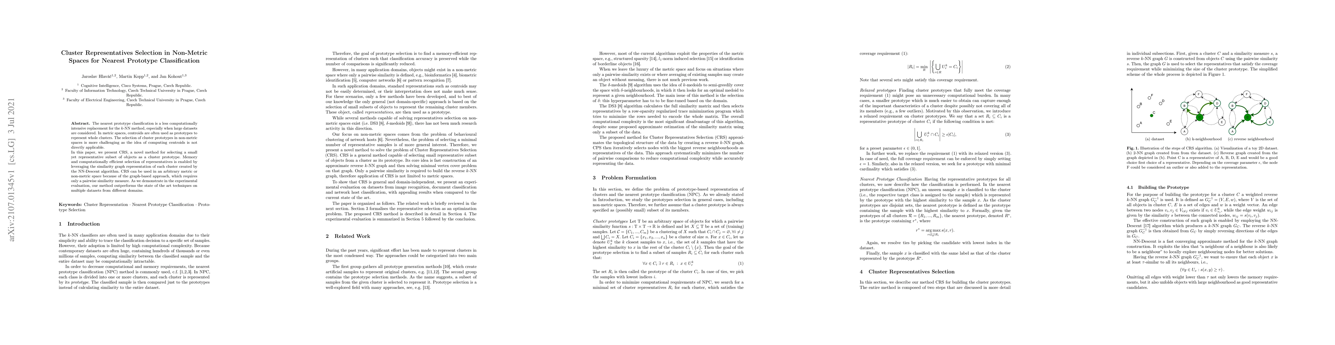 This paper presents CRS, a novel method for selecting representative cluster prototypes in non-metric spaces, enabling efficient nearest prototype classification. CRS leverages a similarity graph representation created by the NN-Descent algorithm, outperforming existing techniques in experimental evaluations.
