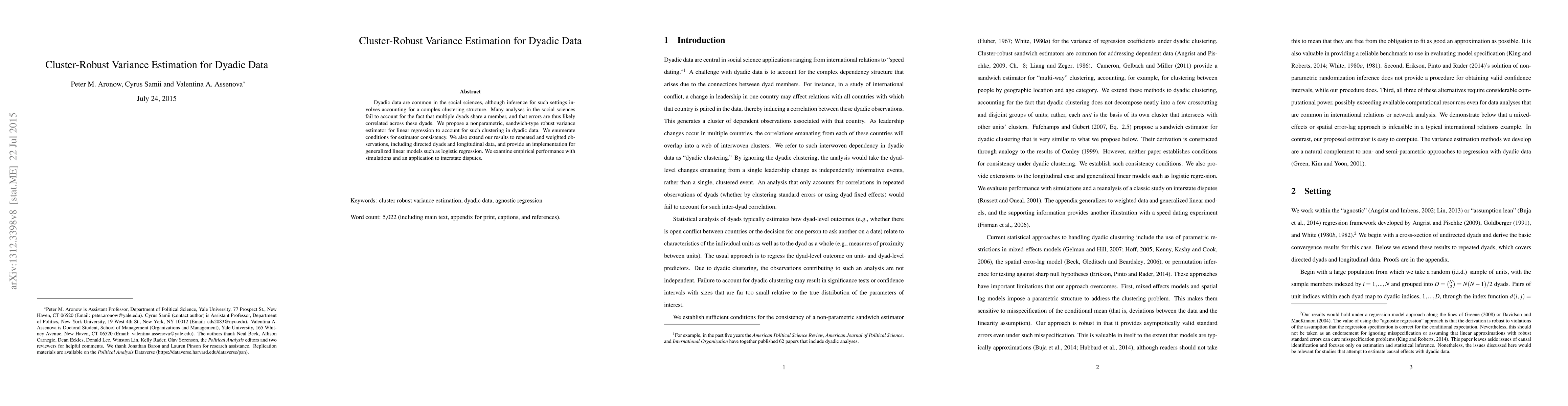 Dyadic data are common in the social sciences, although inference for such settings involves accounting for a complex clustering structure. Many analyses in the social sciences fail to account for the fact that multiple dyads share a member, and that errors are thus likely correlated across these dyads. We propose a nonparametric sandwich-type robust variance estimator for linear regression to account for such clustering in dyadic data. We enumerate conditions for estimator consistency. We also extend our results to repeated and weighted observations, including directed dyads and longitudinal data, and provide an implementation for generalized linear models such as logistic regression. We examine empirical performance with simulations and applications to international relations and speed dating.