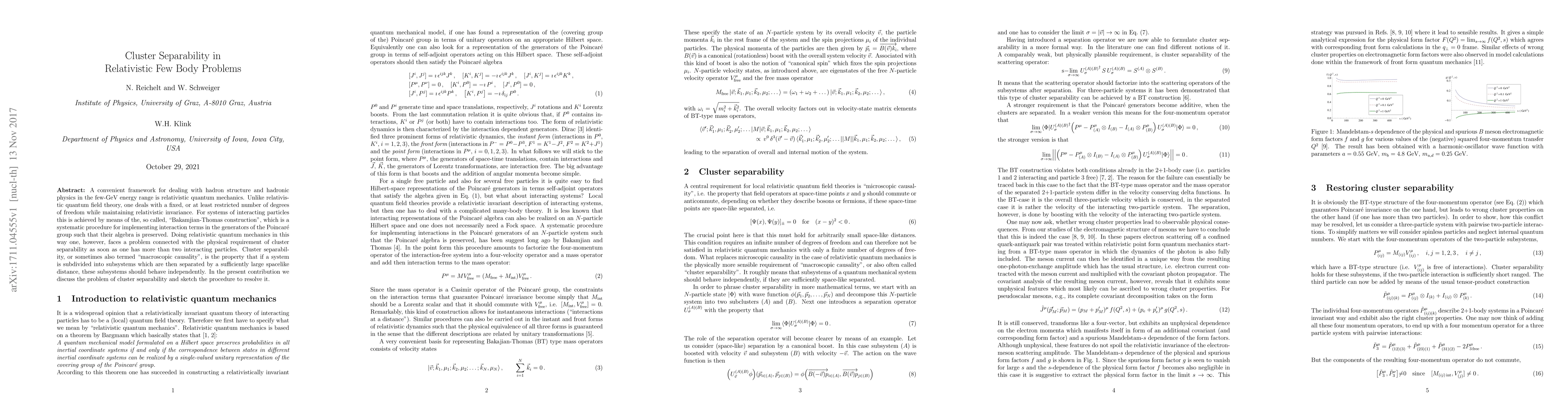 A convenient framework for dealing with hadron structure and hadronic physics in the few-GeV energy range is relativistic quantum mechanics. Unlike relativistic quantum field theory, one deals with a fixed, or at least restricted number of degrees of freedom while maintaining relativistic invariance. For systems of interacting particles this is achieved by means of the, so called, "Bakamjian-Thomas construction", which is a systematic procedure for implementing interaction terms in the generators of the Poincare group such that their algebra is preserved. Doing relativistic quantum mechanics in this way one, however, faces a problem connected with the physical requirement of cluster separability as soon as one has more than two interacting particles. Cluster separability, or sometimes also termed "macroscopic causality", is the property that if a system is subdivided into subsystems which are then separated by a sufficiently large spacelike distance, these subsystems should behave independently. In the present contribution we discuss the problem of cluster separability and sketch the procedure to resolve it.