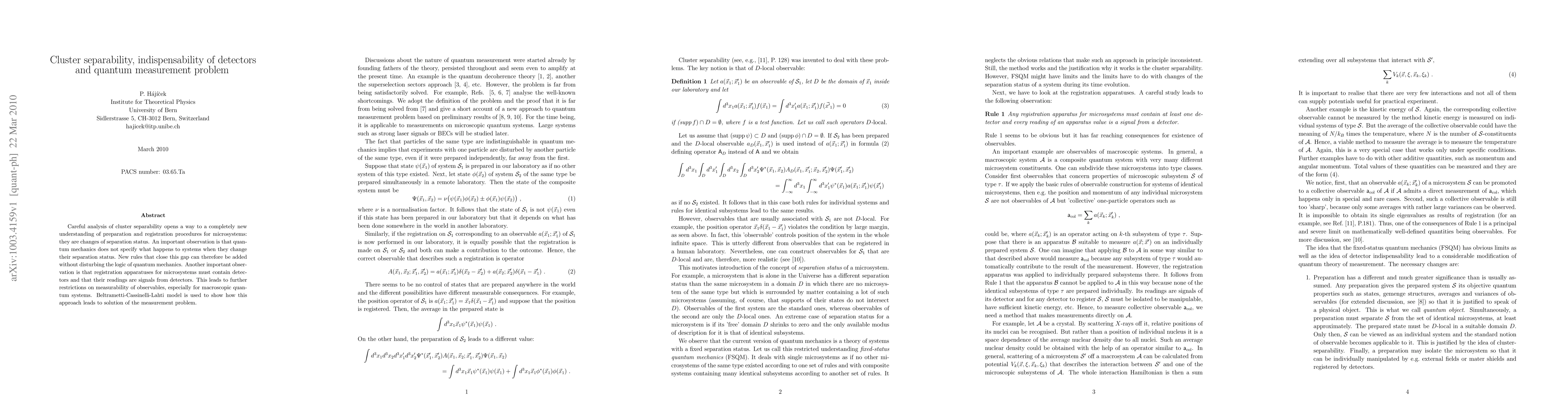 This paper explores cluster separability to redefine preparation and registration of microsystems, noting that quantum mechanics lacks specifics on separation status changes. It argues that new rules can be introduced without conflicting with quantum mechanics, emphasizing the indispensability of detectors in measurement apparatuses and their role in signaling changes, which further constrains measurability, especially for macroscopic quantum systems. The Beltrametti-Cassinelli-Lahti model demonstrates a solution to the quantum measurement problem through this framework.