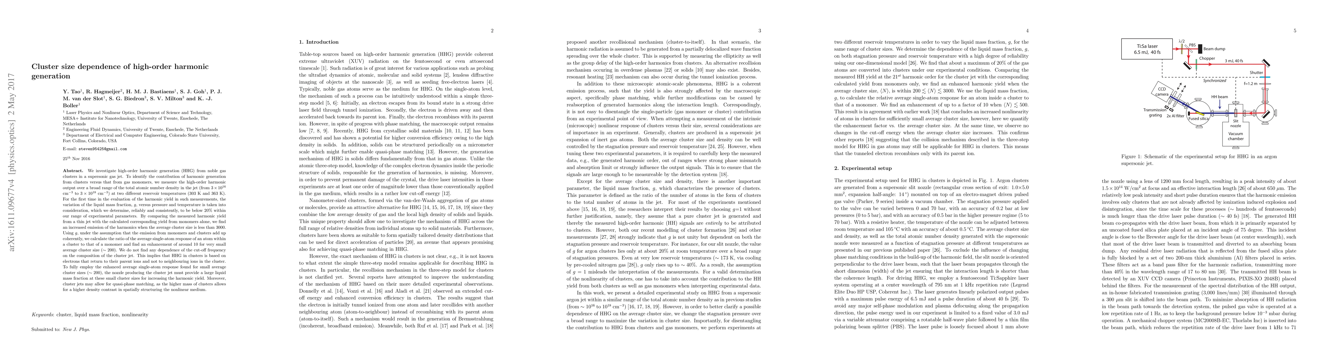 We investigate high-order harmonic generation (HHG) from noble gas clusters in a supersonic gas jet. To identify the contribution of harmonic generation from clusters versus that from gas monomers, we measure the high-order harmonic output over a broad range of the total atomic number density in the jet (from 3*10^16 cm^{-3} to 3x10^18 cm{-3}) at two different reservoir temperatures (303 K and 363 K). For the firrst time in the evaluation of the harmonic yield in such measurements, the variation of the liquid mass fraction, g, versus pressure and temperature is taken into consideration, which we determine, reliably and consistently, to be below 20% within our range of experimental parameters. By comparing the measured harmonic yield from a thin jet with the calculated corresponding yield from monomers alone, we find an increased emission of the harmonics when the average cluster size is less than 3000. Using g, under the assumption that the emission from monomers and clusters add up coherently, we calculate the ratio of the average single-atom response of an atom within a cluster to that of a monomer and find an enhancement of around 10 for very small average cluster size (~200). We do not find any dependence of the cut-off frequency on the composition of the cluster jet. This implies that HHG in clusters is based on electrons that return to their parent ions and not to neighbouring ions in the cluster. To fully employ the enhanced average single-atom response found for small average cluster sizes (~200), the nozzle producing the cluster jet must provide a large liquid mass fraction at these small cluster sizes for increasing the harmonic yield. Moreover, cluster jets may allow for quasi-phase matching, as the higher mass of clusters allows for a higher density contrast in spatially structuring the nonlinear medium.