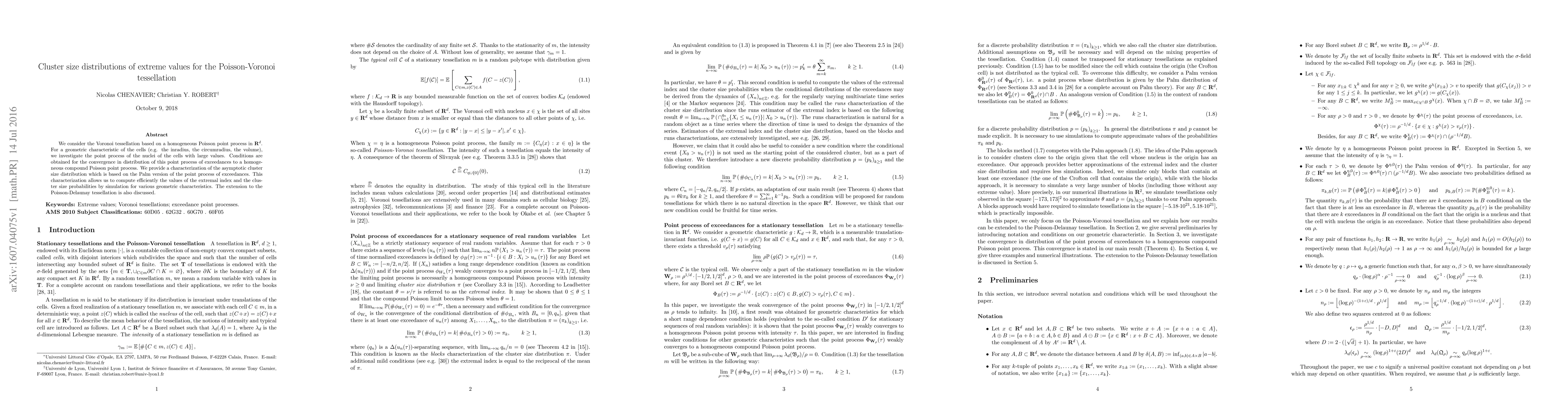 This paper explores the cluster size distributions of extreme values in a Poisson-Voronoi tessellation, deriving conditions for the convergence of the point process of large cells to a homogeneous compound Poisson process. It provides a method for efficiently computing extremal indices and cluster size probabilities through simulation.