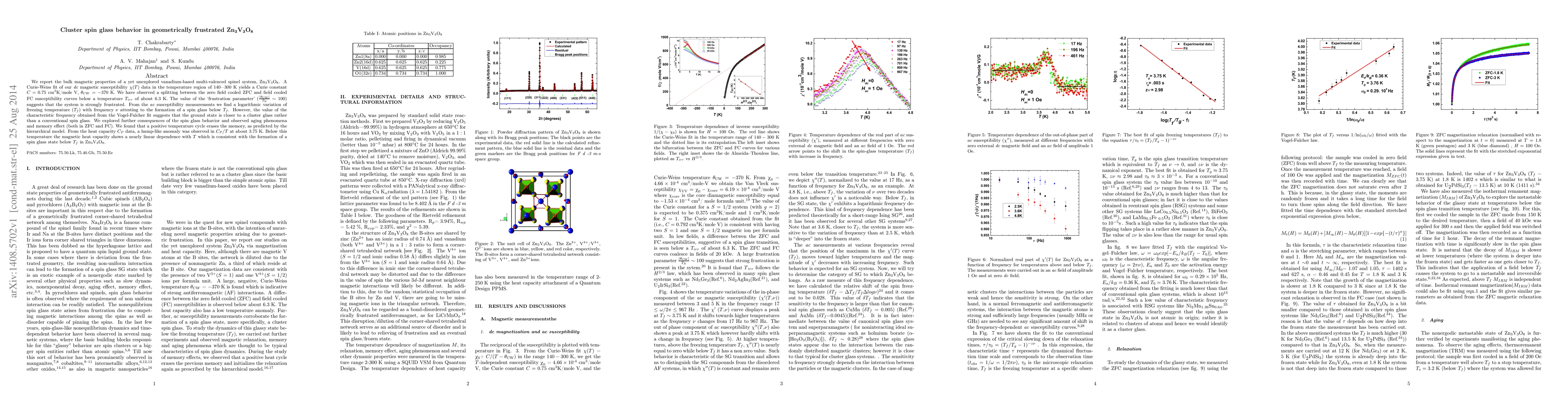 This study investigates the magnetic properties of the Zn3V3O8 spinel system, revealing strong geometric frustration and spin glass behavior. The system exhibits cluster spin glass characteristics evidenced by a logarithmic frequency dependence of freezing temperature and aging phenomena, rather than a conventional spin glass state.