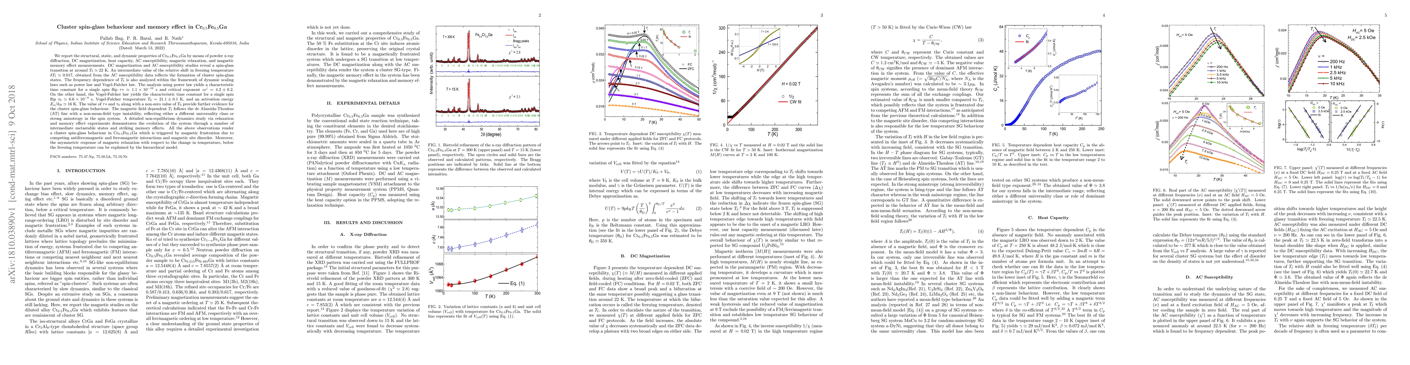 We report the structural, static, and dynamic properties of Cr$_{0.5}$Fe$_{0.5}$Ga by means of powder x-ray diffraction, magnetization, heat capacity, magnetic relaxation, and magnetic memory effect measurements. DC magnetization and AC susceptibility studies reveal a spin-glass transition at around $T_{\rm f} \simeq 22$~K. An intermediate value of the relative shift in freezing temperature $\delta T_{\rm f} \simeq 0.017$, obtained from the AC susceptibility data reflects the formation of cluster spin-glass states. The frequency dependence of $T_{\rm f}$ is also analyzed within the framework of dynamic scaling laws. The analysis using power law yields a time constant for a single spin flip $\tau* \simeq 1.1\times10^{-10}$~s and critical exponent $z\nu^{\prime}=4.2\pm0.2$. On the other hand, the Vogel-Fulcher (VF) law yields the time constant for a single spin flip $\tau_0 \simeq 6.6\times10^{-9}$~s, VF temperature $T_{\rm 0}=21.1\pm0.1$~K, and an activation energy $E_{\rm a}/k_{\rm B} \simeq 16$~K. The value of $\tau*$ and $\tau_0$ along with a non-zero value of $T_{\rm 0}$ provide further evidence for the cluster spin-glass behaviour. The magnetic field dependent $T_{\rm f}$ follows the de Almeida-Thouless line with a non-mean-field type instability, reflecting either a different universality class or strong anisotropy in the spin system. A detailed non-equilibrium dynamics study via relaxation and memory effect experiments demonstrates striking memory effects. All the above observations render a cluster spin-glass behaviour which is triggered by magnetic frustration due to competing antiferromagnetic and ferromagnetic interactions and magnetic site disorder. Moreover, the asymmetric response of magnetic relaxation with respect to the change in temperature, below $T_{\rm f}$ can be explained by the hierarchical model.