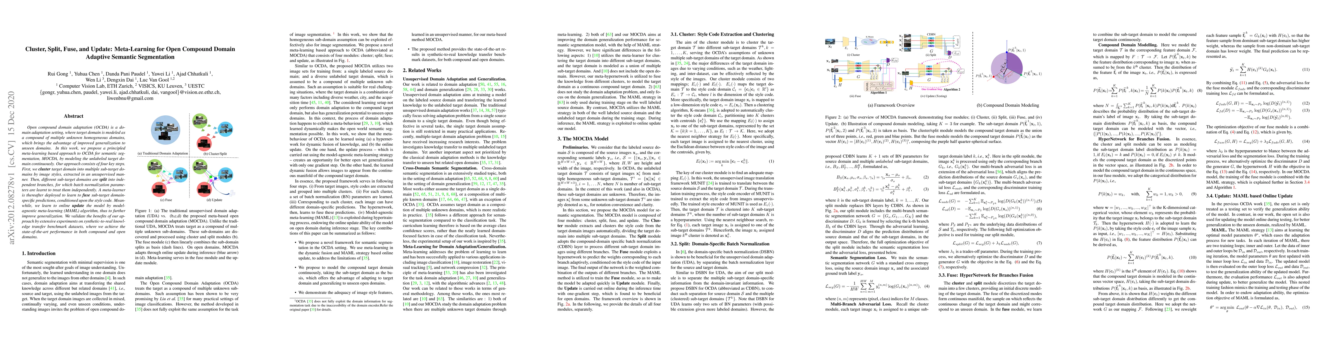 This research proposes a meta-learning approach, MOCDA, for open compound domain adaptation in semantic segmentation. It clusters and splits the target domain into sub-domains, fuses their predictions, and updates the model using MAML, achieving state-of-the-art performance.