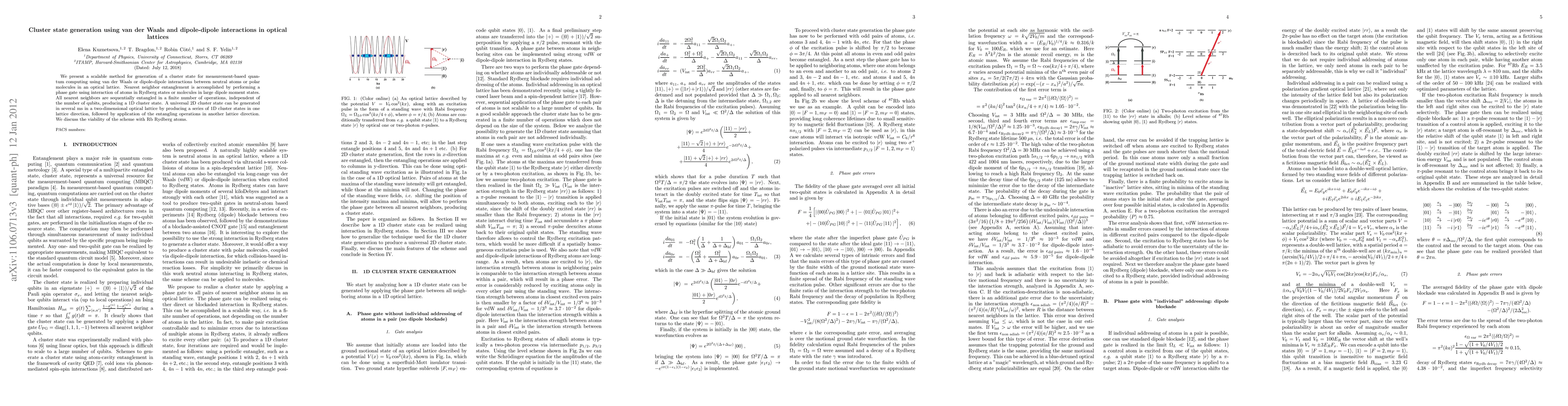 This paper proposes a scalable method for generating cluster states for quantum computing using van der Waals or dipole-dipole interactions in optical lattices. The method sequentially entangles nearest neighbors to produce a 1D cluster state, which can be extended to a universal 2D cluster state in milliseconds, demonstrating feasibility with Rb Rydberg atoms.
