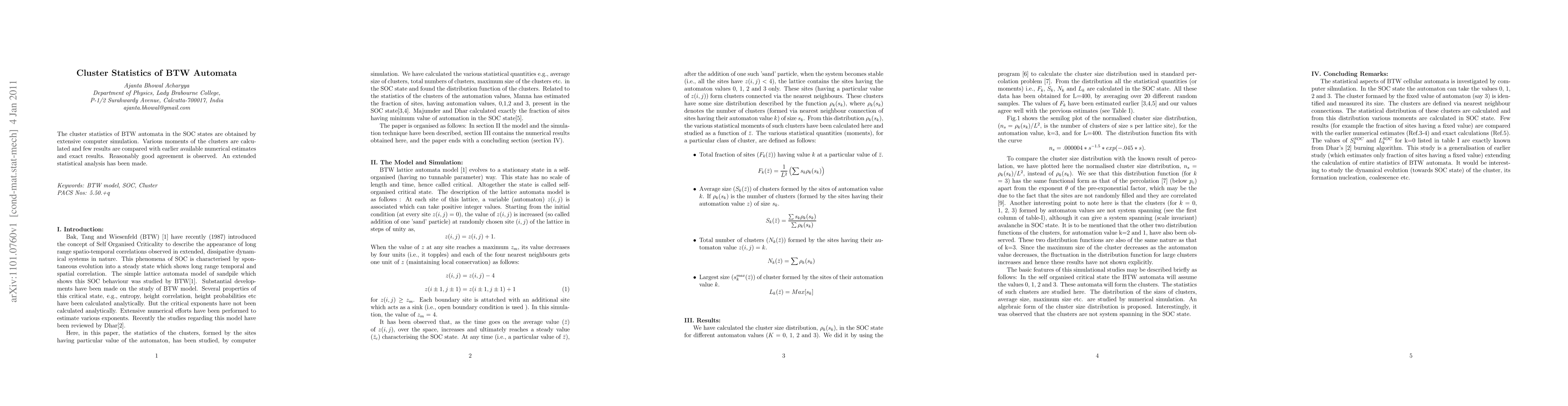 The cluster statistics of BTW automata in the SOC states are obtained by extensive computer simulation. Various moments of the clusters are calculated and few results are compared with earlier available numerical estimates and exact results. Reasonably good agreement is observed. An extended statistical analysis has been made.