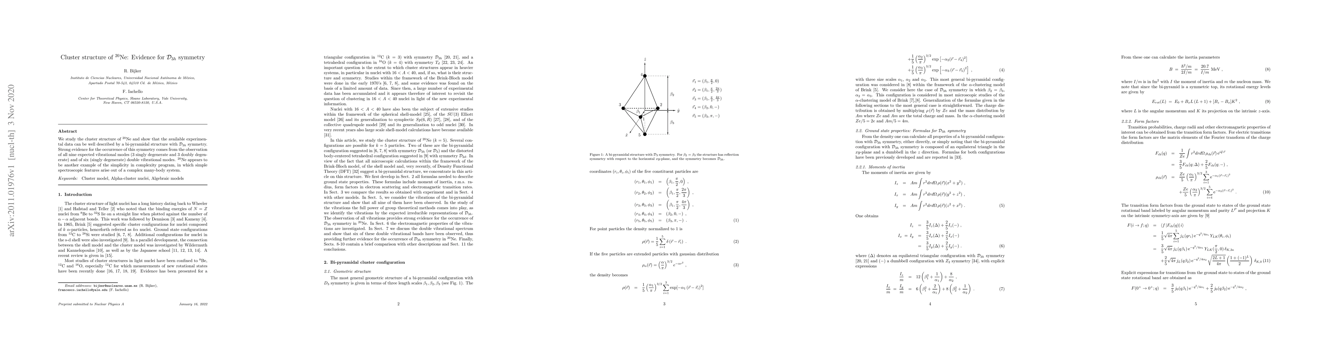 We study the cluster structure of 20Ne and show that the available experimental data can be well described by a bi-pyramidal structure with D(3h) symmetry. Strong evidence for the occurrence of this symmetry comes from the observation of all nine expected vibrational modes (3 singly degenerate and 3 doubly degenerate) and of six (singly degenerate) double vibrational modes. 20Ne appears to be another example of the simplicity in complexity program, in which simple spectroscopic features arise out of a complex many-body system.