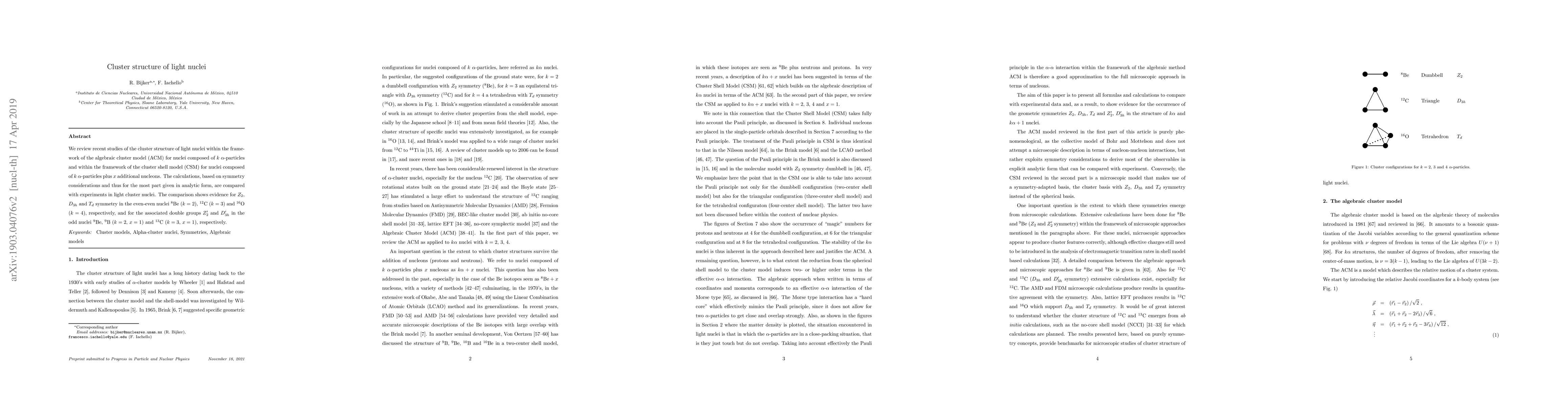 This paper reviews recent studies on the cluster structure of light nuclei using the algebraic cluster model and the cluster shell model, finding evidence for Z_2, D_{3h}, and T_d symmetries in even-even nuclei and for Z'_2 and D'_{3h} in odd nuclei, as compared with experimental data.