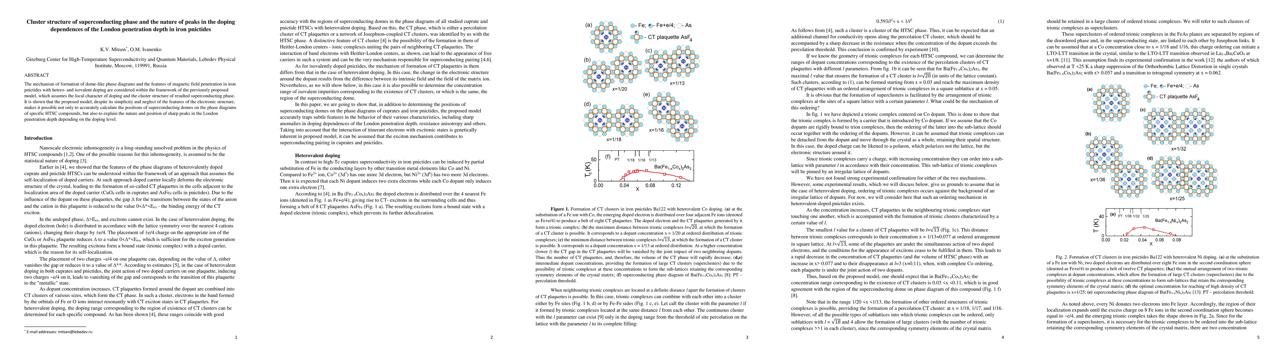 The mechanism of formation of dome-like phase diagrams and the features of magnetic field penetration in iron pnictides with hetero- and isovalent doping are considered within the framework of the previously proposed model, which assumes the local character of doping and the cluster structure of resulted superconducting phase. It is shown that the proposed model, despite its simplicity and neglect of the features of the electronic structure, makes it possible not only to accurately calculate the positions of superconducting domes on the phase diagrams of specific HTSC compounds, but also to explain the nature and position of sharp peaks in the London penetration depth depending on the doping level.