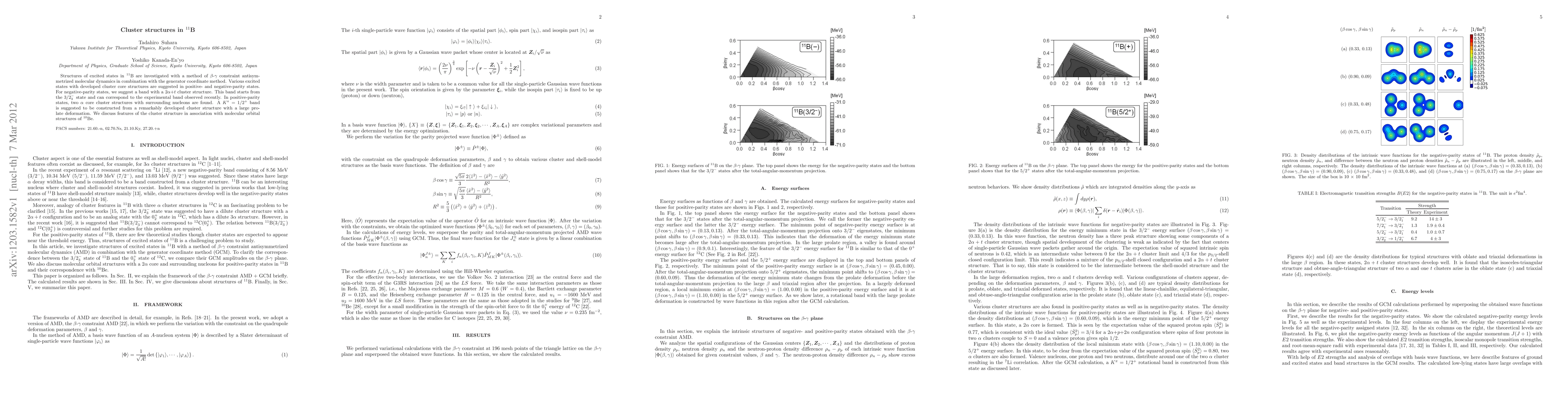 This study investigates excited states in $^{11}$B using $\beta$-$\gamma$ constrained antisymmetrized molecular dynamics and the generator coordinate method, suggesting various cluster core structures in both positive- and negative-parity states, including a $2\alpha+t$ cluster band in negative-parity and $\alpha$ core clusters in positive-parity.