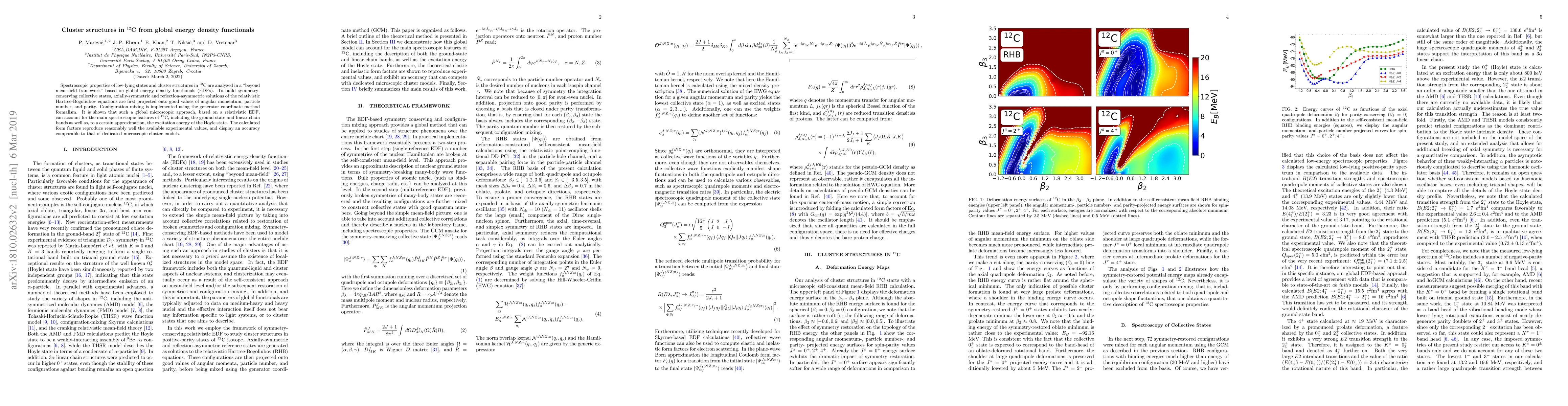 Spectroscopic properties of low-lying states and cluster structures in $^{12}$C are analyzed in a "beyond mean-field framework" based on global energy density functionals (EDFs). To build symmetry-conserving collective states, axially-symmetric and reflection-asymmetric solutions of the relativistic Hartree-Bogoliubov equations are first projected onto good values of angular momentum, particle number, and parity. Configuration mixing is implemented using the generator coordinate method formalism. It is shown that such a global microscopic approach, based on a relativistic EDF, can account for the main spectroscopic features of $^{12}$C, including the ground-state and linear-chain bands as well as, to a certain approximation, the excitation energy of the Hoyle state. The calculated form factors reproduce reasonably well the available experimental values, and display an accuracy comparable to that of dedicated microscopic cluster models.