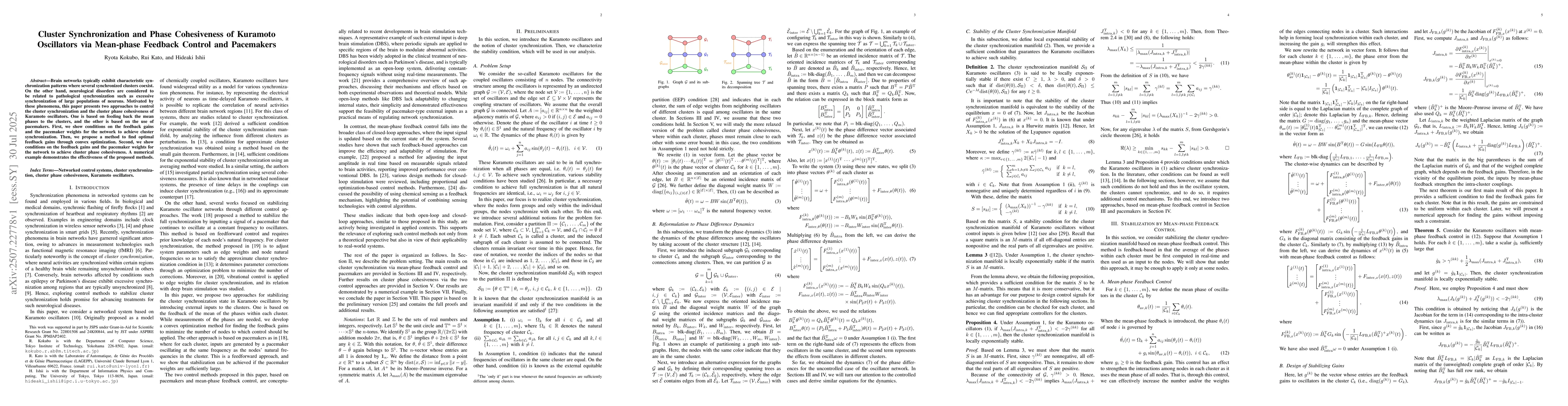 This paper presents methods to control cluster synchronization and phase cohesiveness in Kuramoto oscillators, mimicking brain network behaviors. It details conditions for feedback gains and pacemaker weights to achieve desired synchronization, and proposes an optimization method for finding optimal gains. A numerical example validates these techniques.
