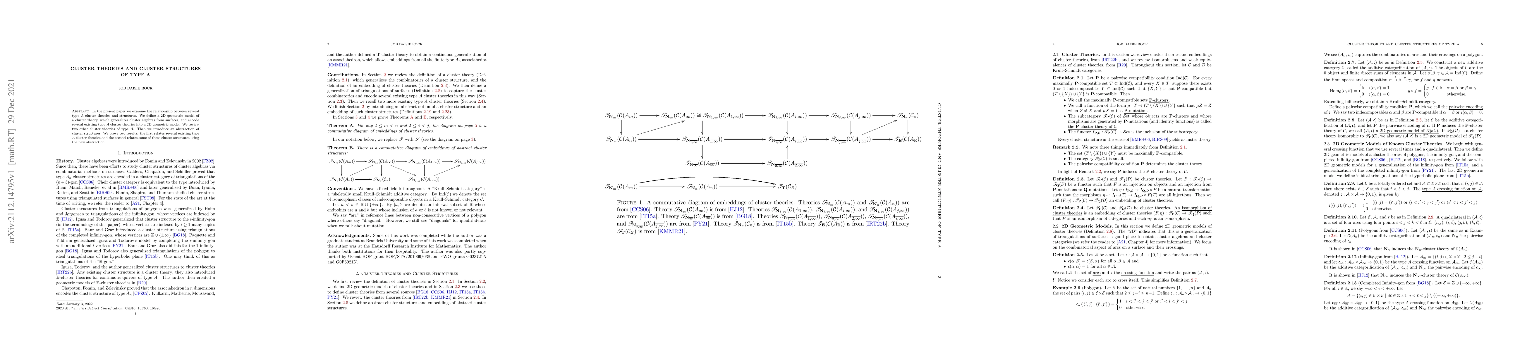 This paper explores the connections between various type $A$ cluster theories and structures, defining a 2D geometric model that generalizes cluster algebras. It also introduces an abstraction of cluster structures and proves two results linking existing theories and the new abstraction.