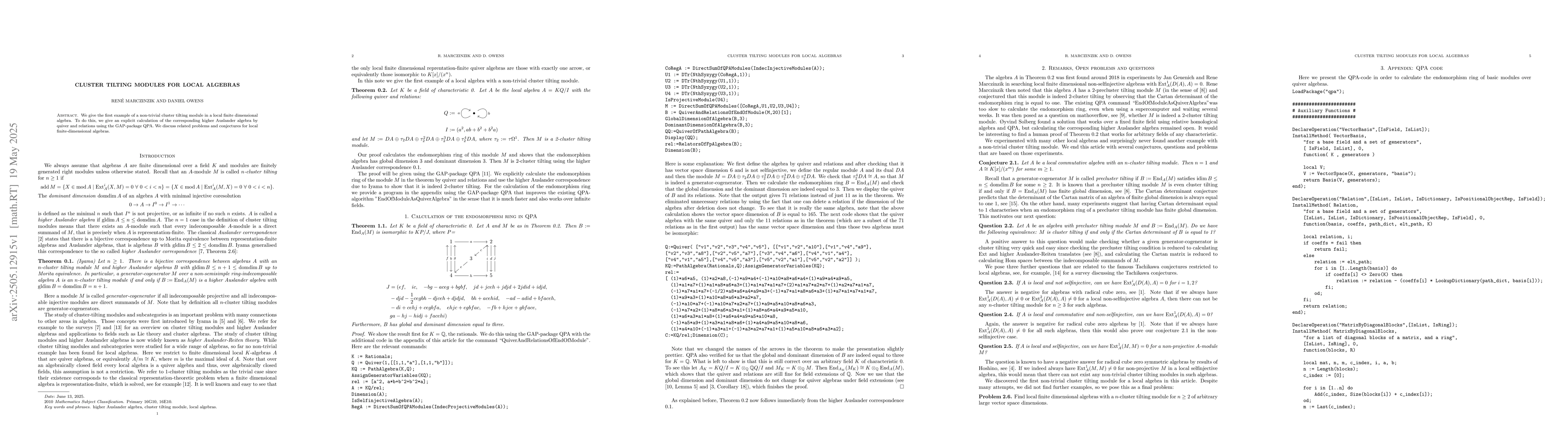 This paper presents the first concrete example of a cluster tilting module in local finite-dimensional algebras, advancing knowledge in the field.