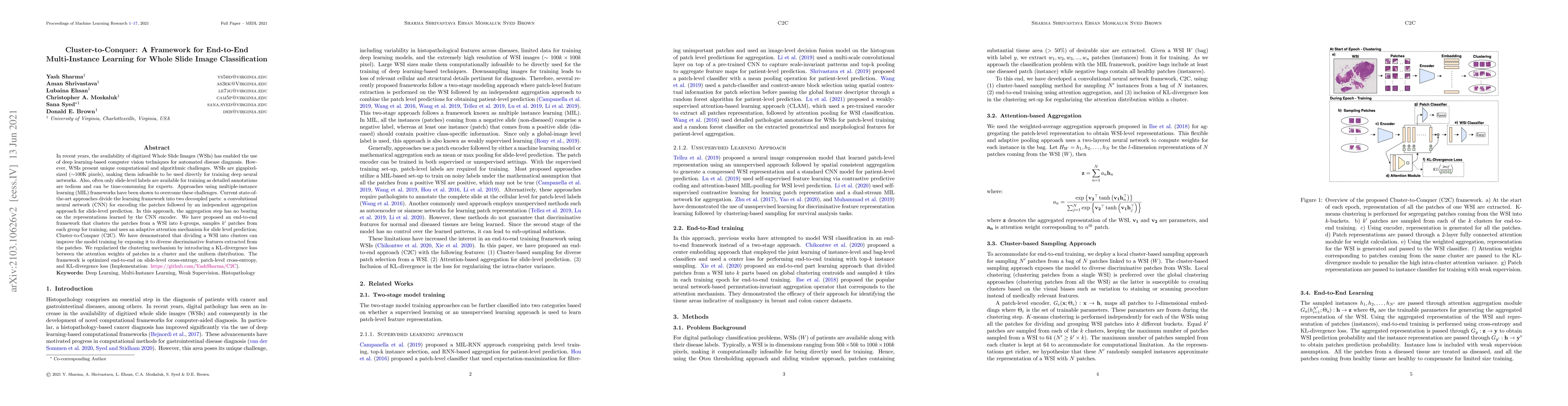 The paper proposes Cluster-to-Conquer (C2C), an end-to-end multi-instance learning framework for classifying Whole Slide Images (WSIs) using deep learning. It clusters WSI patches, samples patches from each cluster for training, and employs an adaptive attention mechanism for slide-level prediction, optimizing the model through cross-entropy and KL-divergence losses.
