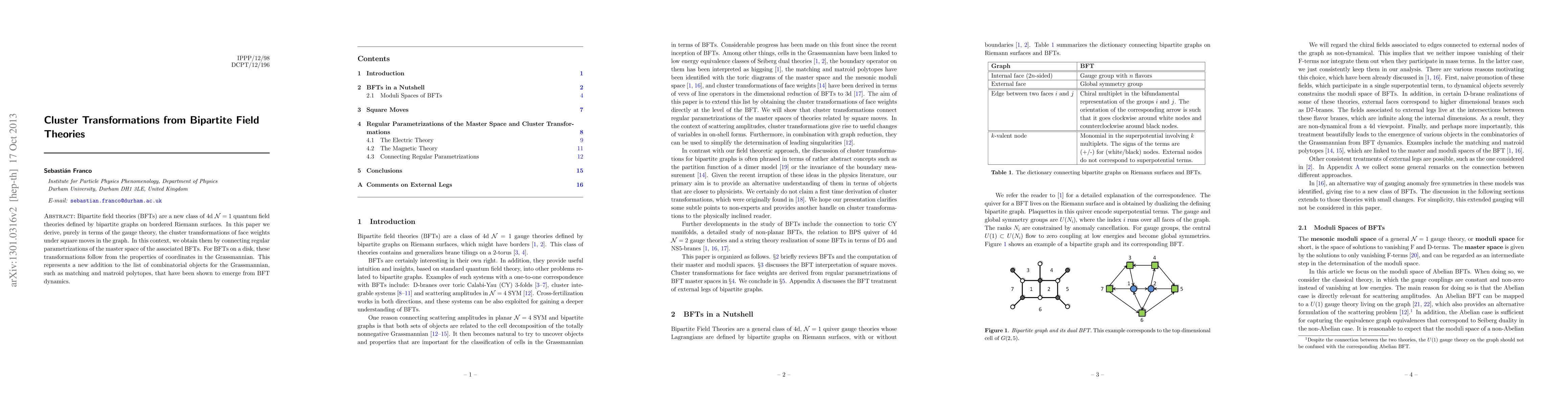 Bipartite field theories (BFTs) are a new class of 4d N=1 quantum field theories defined by bipartite graphs on bordered Riemann surfaces. In this paper we derive, purely in terms of the gauge theory, the cluster transformations of face weights under square moves in the graph. In this context, we obtain them by connecting regular parametrizations of the master space of the associated BFTs. For BFTs on a disk, these transformations follow from the properties of coordinates in the Grassmannian. This represents a new addition to the list of combinatorial objects for the Grassmannian, such as matching and matroid polytopes, that have been shown to emerge from BFT dynamics.