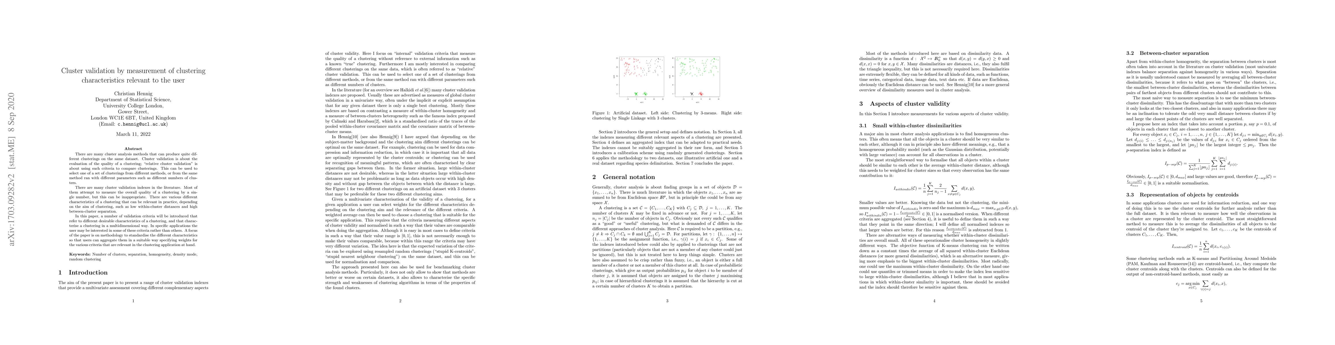 This paper proposes a new approach to cluster validation that considers multiple characteristics of clustering relevant to users, such as within-cluster distance and between-cluster separation, to improve the selection of optimal clusters.