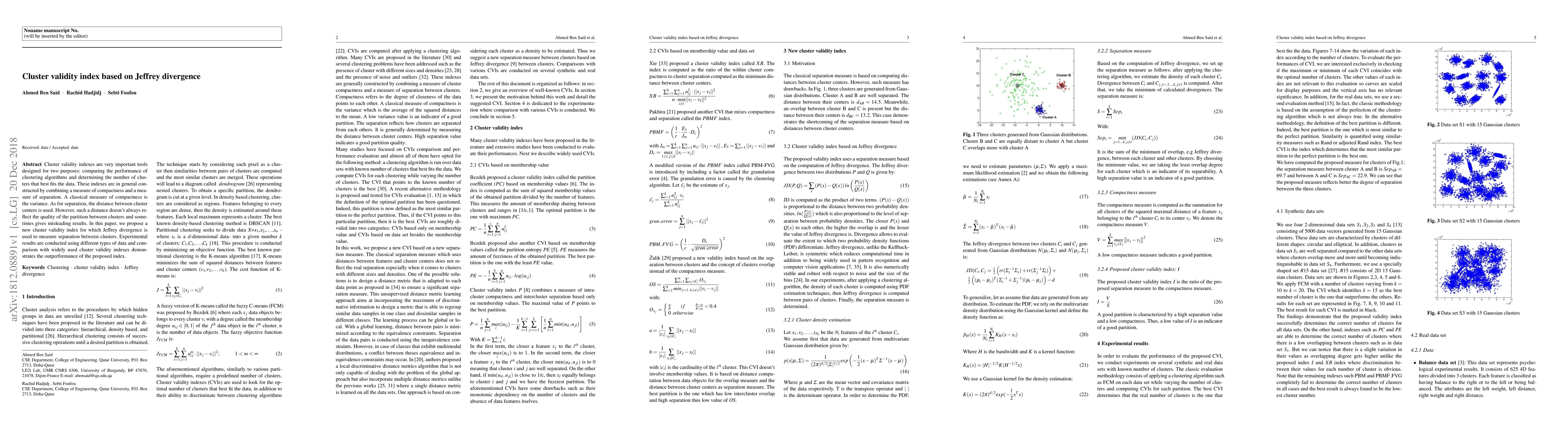 This paper proposes a new cluster validity index using Jeffrey divergence to measure separation between clusters, aiming to improve upon traditional measures like variance and distance between cluster centers. Experimental results show that this new index outperforms existing methods in determining optimal cluster numbers across various datasets.