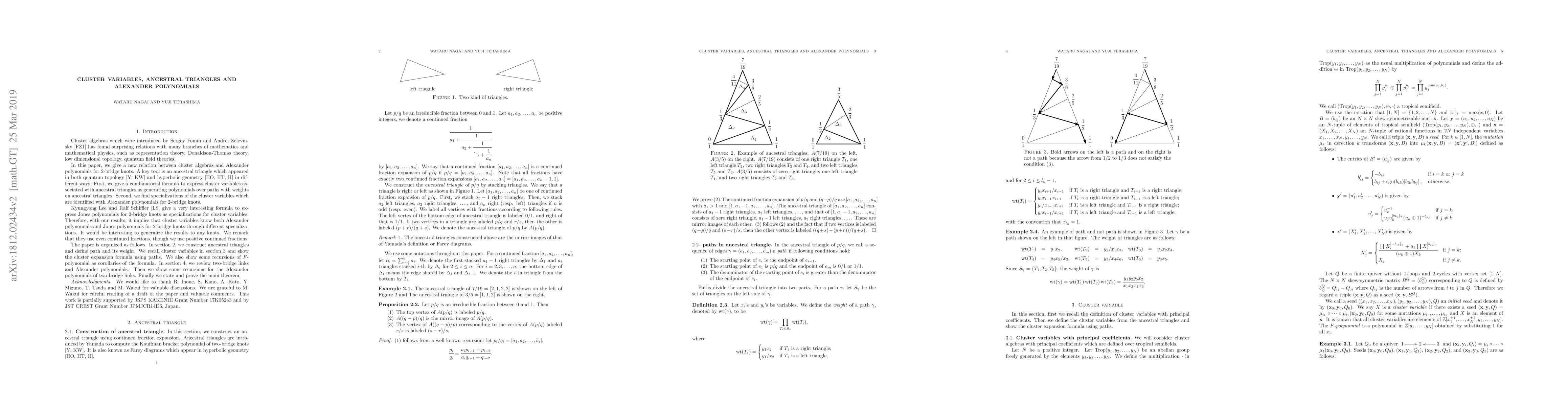 Summary: This paper demonstrates that Alexander polynomials for 2-bridge knots are specializations of cluster variables, utilizing the concept of an ancestral triangle, a versatile tool found in both quantum topology and hyperbolic geometry.