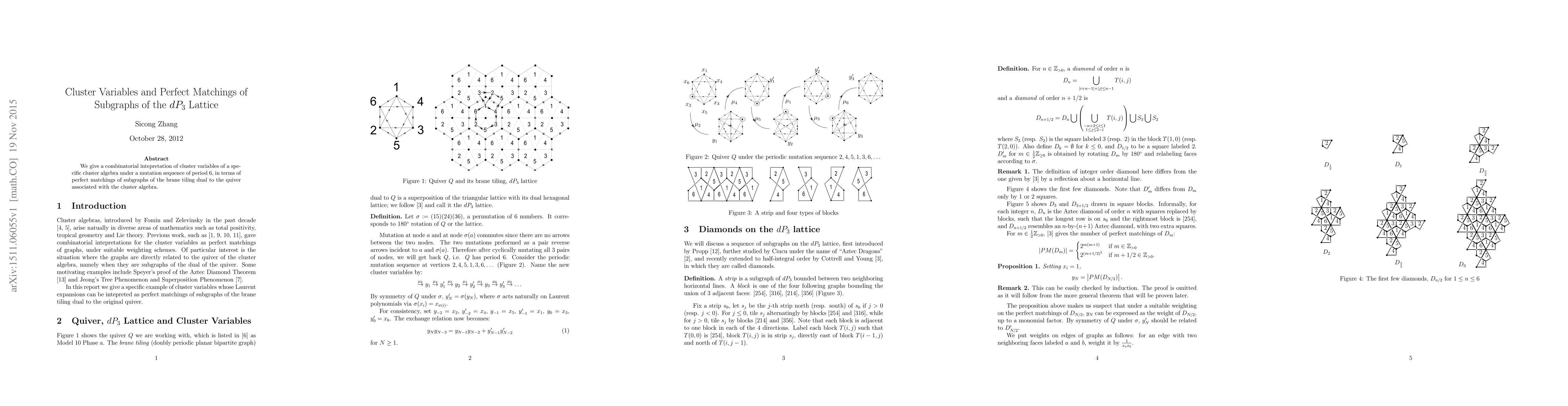 We give a combinatorial intepretation of cluster variables of a specific cluster algebra under a mutation sequence of period 6, in terms of perfect matchings of subgraphs of the brane tiling dual to the quiver associated with the cluster algebra.