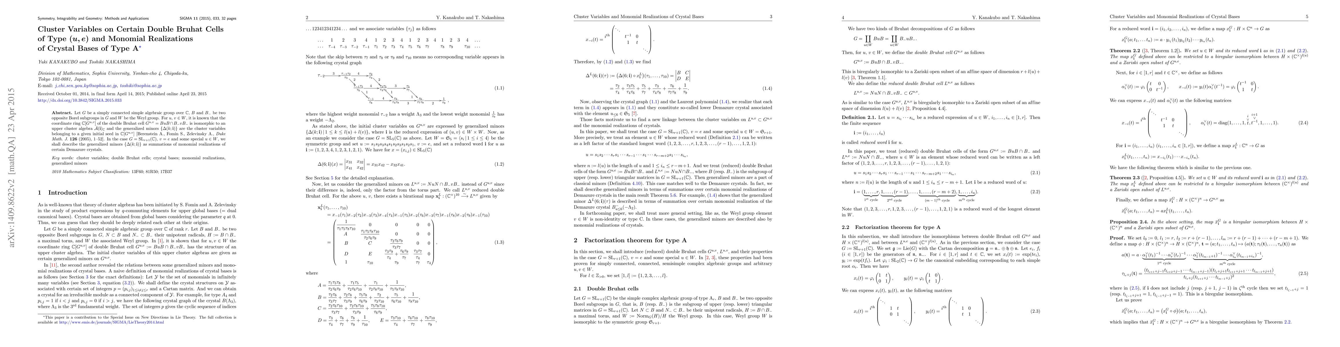Let $G$ be a simply connected simple algebraic group over $\mathbb{C}$, $B$ and $B_-$ be two opposite Borel subgroups in $G$ and $W$ be the Weyl group. For $u$, $v\in W$, it is known that the coordinate ring ${\mathbb C}[G^{u,v}]$ of the double Bruhat cell $G^{u,v}=BuB\cap B_-vB_-$ is isomorphic to an upper cluster algebra $\bar{{\mathcal A}}({\bf i})_{{\mathbb C}}$ and the generalized minors $\{\Delta(k;{\bf i})\}$ are the cluster variables belonging to a given initial seed in ${\mathbb C}[G^{u,v}]$ [Berenstein A., Fomin S., Zelevinsky A., Duke Math. J. 126 (2005), 1-52, math.RT/0305434]. In the case $G={\rm SL}_{r+1}({\mathbb C})$, $v=e$ and some special $u\in W$, we shall describe the generalized minors $\{\Delta(k;{\bf i})\}$ as summations of monomial realizations of certain Demazure crystals.