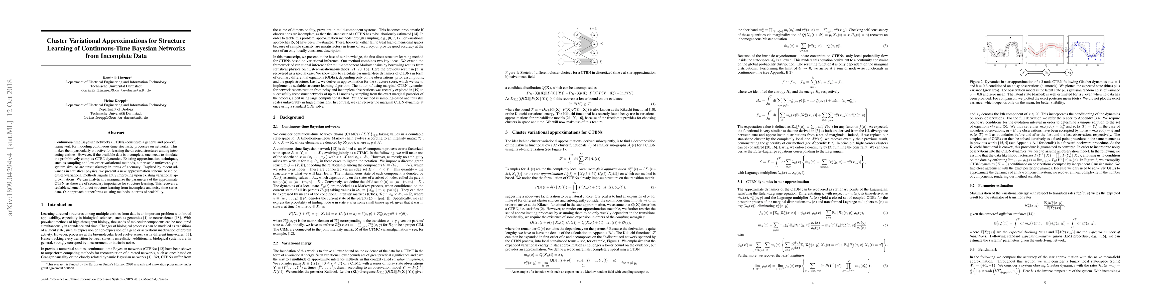 This paper introduces a new cluster-variational approximation method for learning the structure of continuous-time Bayesian networks (CTBNs) from incomplete data. The proposed approach significantly improves scalability and accuracy over existing techniques, enabling efficient structure learning from noisy time-series data.
