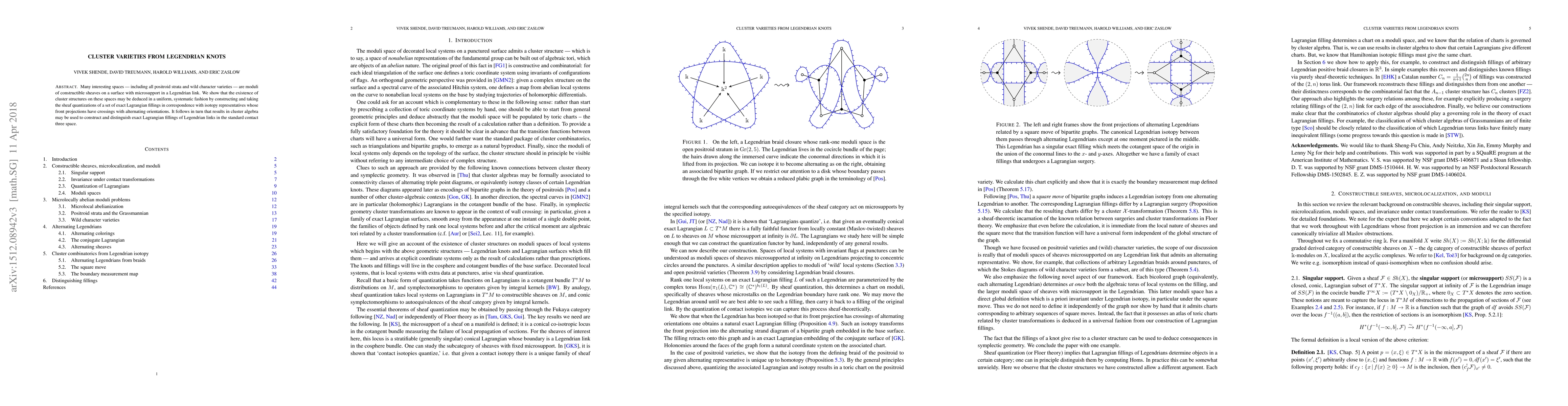 Many interesting spaces --- including all positroid strata and wild character varieties --- are moduli of constructible sheaves on a surface with microsupport in a Legendrian link. We show that the existence of cluster structures on these spaces may be deduced in a uniform, systematic fashion by constructing and taking the sheaf quantizations of a set of exact Lagrangian fillings in correspondence with isotopy representatives whose front projections have crossings with alternating orientations. It follows in turn that results in cluster algebra may be used to construct and distinguish exact Lagrangian fillings of Legendrian links in the standard contact three space.