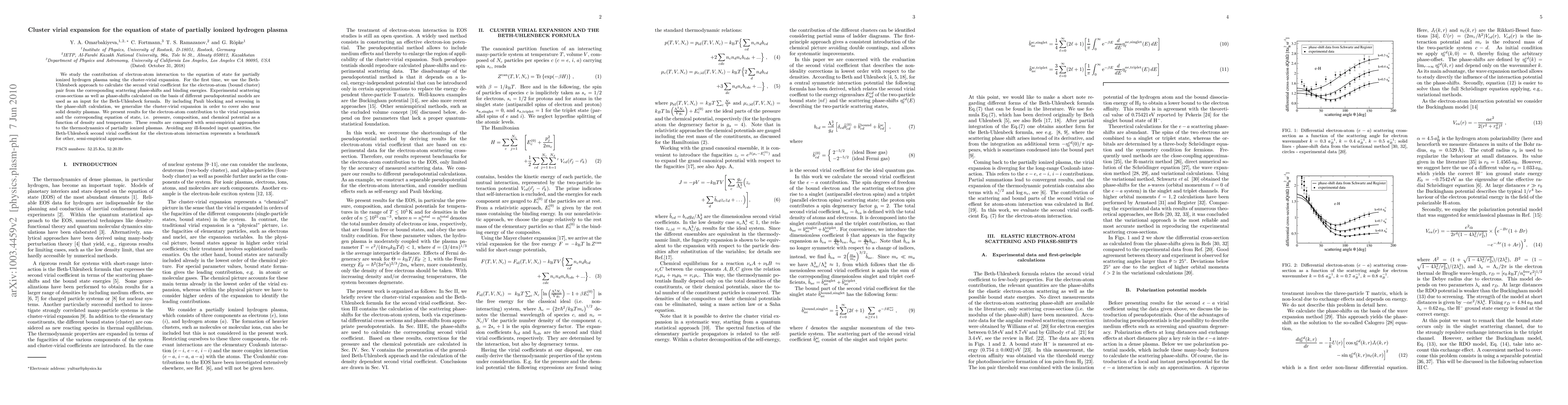This paper investigates the electron-atom interaction in partially ionized hydrogen plasma using the cluster-virial expansion and the Beth-Uhlenbeck approach to calculate the second virial coefficient. The results provide a benchmark for the thermodynamics of partially ionized plasmas, offering insights into pressure, composition, and chemical potential.