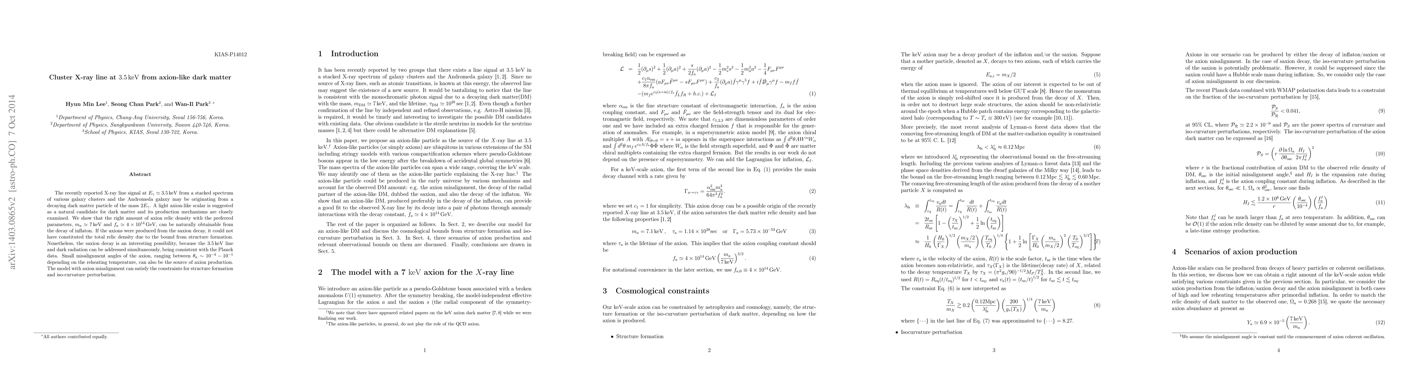 The paper proposes that a $3.5\,{\rm keV}$ X-ray line observed in galaxy clusters may originate from decaying axion-like dark matter particles. It suggests that axions with specific parameters can naturally account for the observed line and dark matter density, potentially produced from inflaton or saxion decay.