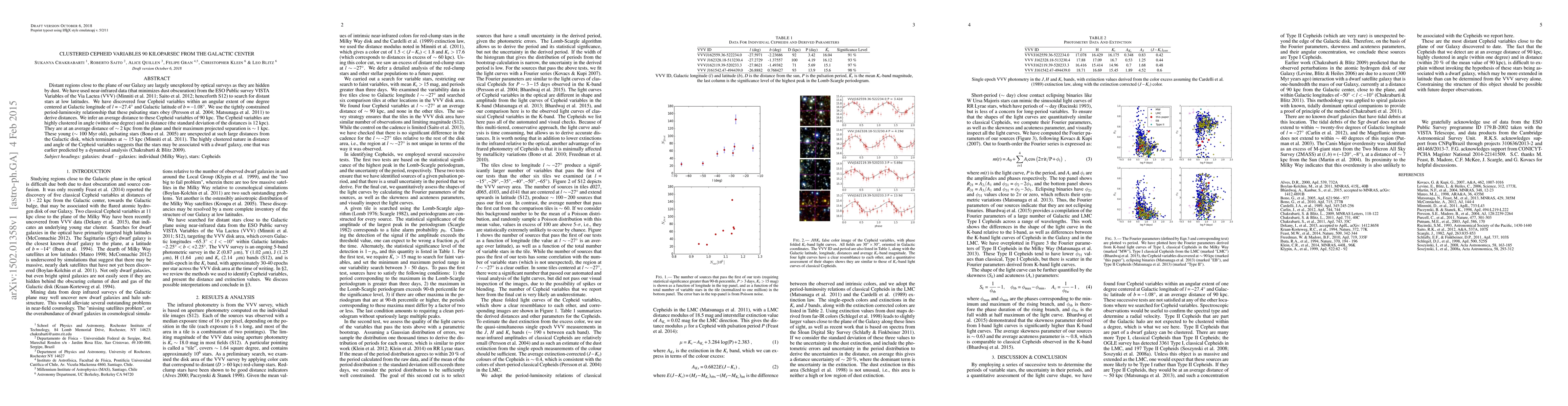 Distant regions close to the plane of our Galaxy are largely unexplored by optical surveys as they are hidden by dust. We have used near-infrared data (that minimizes dust obscuration) from the ESO Public survey VISTA Variables of the Via Lactea (VVV) (Minniti et al. 2011; Saito et al. 2012; henceforth S12) to search for distant stars at low latitudes. We have discovered four Cepheid variables within an angular extent of one degree centered at Galactic longitude of $l = -27.4^\circ$ and Galactic latitude of $b = -1.08 ^\circ$. We use the tightly constrained period-luminosity relationship that these pulsating stars obey (Persson et al. 2004; Matsunaga et al. 2011) to derive distances. We infer an average distance to these Cepheid variables of 90 kpc. The Cepheid variables are highly clustered in angle (within one degree) and in distance (the standard deviation of the distances is 12 kpc). They are at an average distance of $\sim 2~\rm kpc$ from the plane and their maximum projected separation is $\sim 1~ \rm kpc$. These young ($\sim$ 100 Myr old), pulsating stars (Bono et al. 2005) are unexpected at such large distances from the Galactic disk, which terminates at $\sim$ 15 kpc (Minniti et al. 2011). The highly clustered nature in distance and angle of the Cepheid variables suggests that the stars may be associated with a dwarf galaxy, one that was earlier predicted by a dynamical analysis (Chakrabarti \& Blitz 2009).