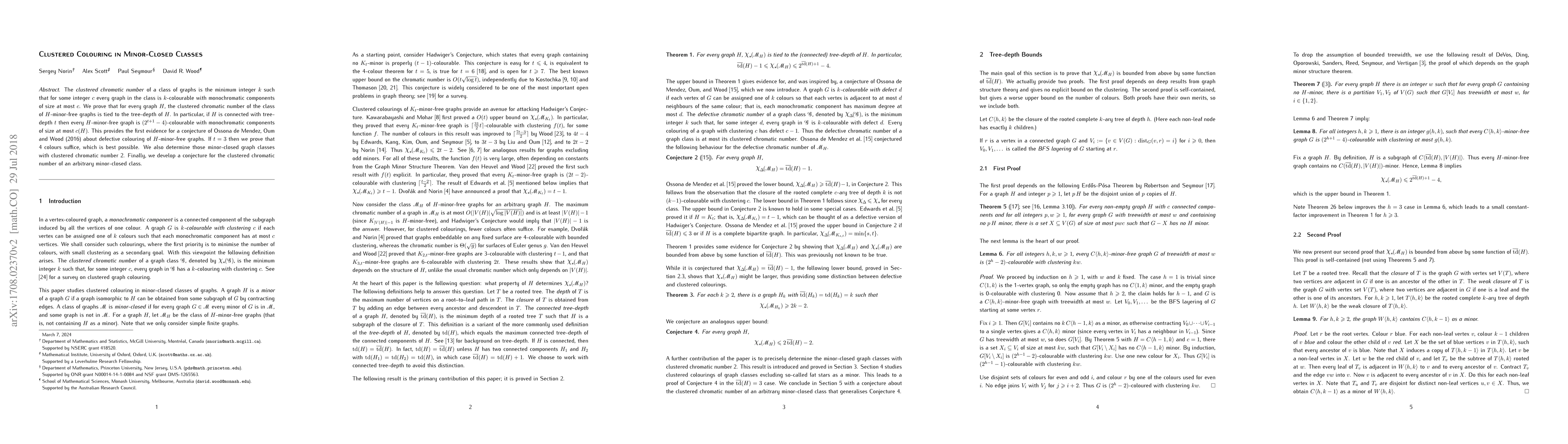 This paper explores the "clustered chromatic number" of minor-closed graph classes, proving that it correlates with the tree-depth of the forbidden minor $H$. Specifically, every $H$-minor-free graph can be $(2^{t+1}-4)$-coloured with monochromatic components of limited size, supporting a conjecture by Ossona de Mendez, Oum, and Wood.