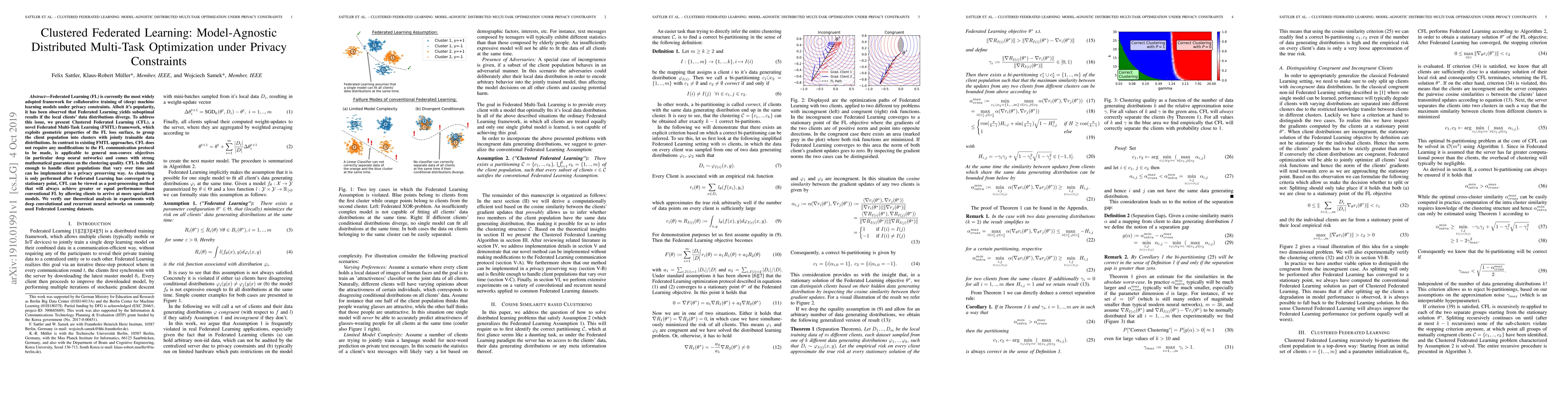 Clustered Federated Learning (CFL) introduces a novel framework for distributed multi-task optimization under privacy constraints, addressing the issue of suboptimal results in Federated Learning due to divergent local data distributions. CFL groups clients into clusters for jointly trainable data distributions, enhancing model performance without altering the FL communication protocol.