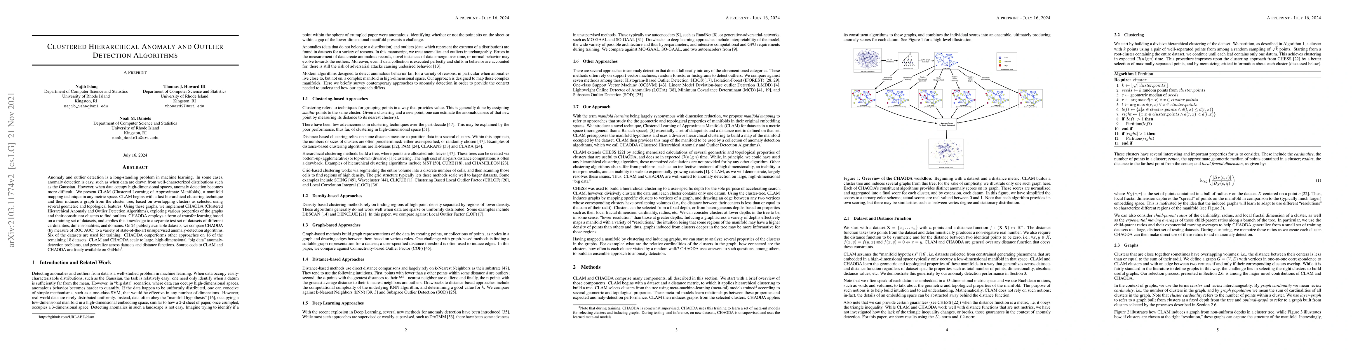 This paper introduces CLAM, a manifold mapping technique for anomaly detection, and CHAODA, a hierarchical clustering-based anomaly and outlier detection algorithm. CHAODA outperforms state-of-the-art algorithms on 16 out of 18 tested datasets, demonstrating scalability and generalization across diverse datasets and distance functions.
