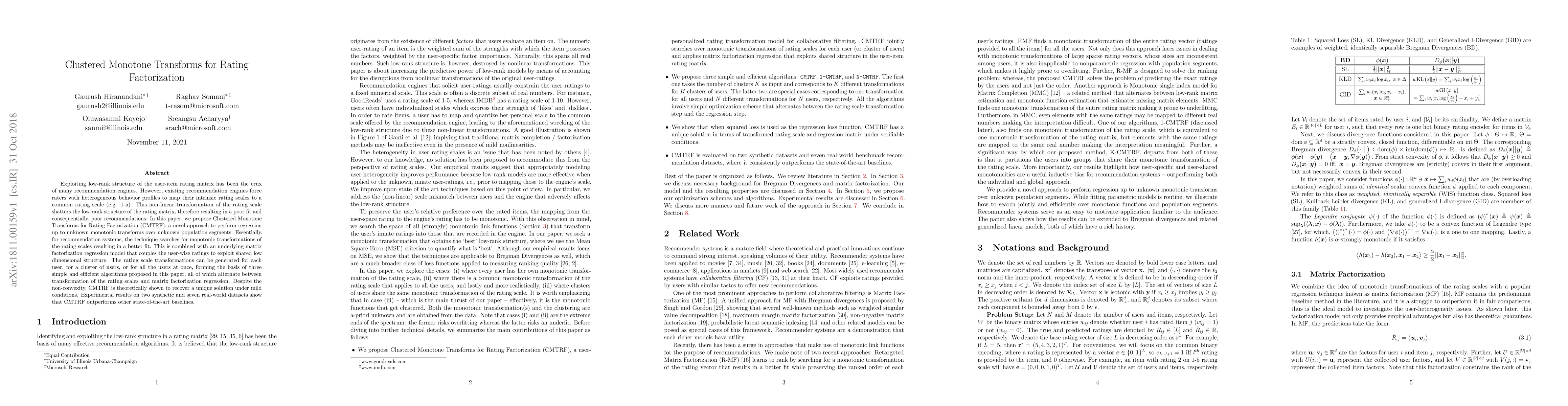 Exploiting low-rank structure of the user-item rating matrix has been the crux of many recommendation engines. However, existing recommendation engines force raters with heterogeneous behavior profiles to map their intrinsic rating scales to a common rating scale (e.g. 1-5). This non-linear transformation of the rating scale shatters the low-rank structure of the rating matrix, therefore resulting in a poor fit and consequentially, poor recommendations. In this paper, we propose Clustered Monotone Transforms for Rating Factorization (CMTRF), a novel approach to perform regression up to unknown monotonic transforms over unknown population segments. Essentially, for recommendation systems, the technique searches for monotonic transformations of the rating scales resulting in a better fit. This is combined with an underlying matrix factorization regression model that couples the user-wise ratings to exploit shared low dimensional structure. The rating scale transformations can be generated for each user, for a cluster of users, or for all the users at once, forming the basis of three simple and efficient algorithms proposed in this paper, all of which alternate between transformation of the rating scales and matrix factorization regression. Despite the non-convexity, CMTRF is theoretically shown to recover a unique solution under mild conditions. Experimental results on two synthetic and seven real-world datasets show that CMTRF outperforms other state-of-the-art baselines.