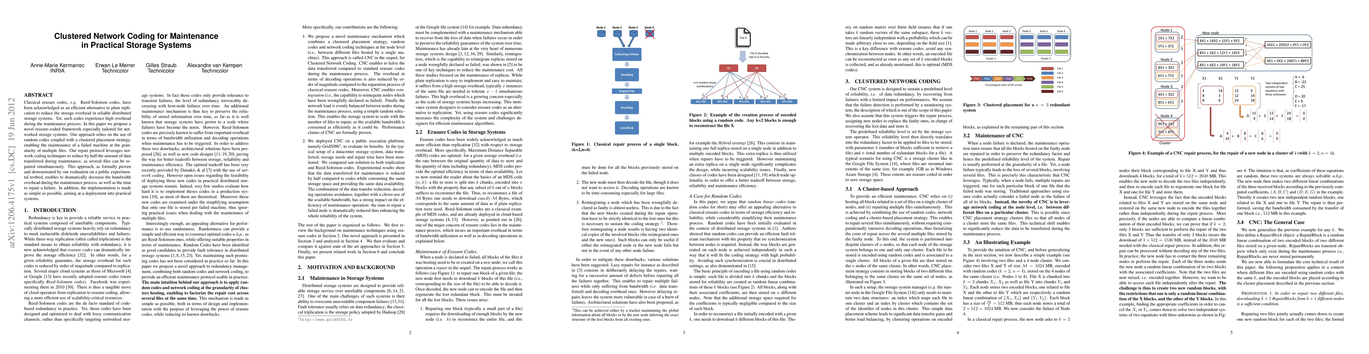 Classical erasure codes, e.g. Reed-Solomon codes, have been acknowledged as an efficient alternative to plain replication to reduce the storage overhead in reliable distributed storage systems. Yet, such codes experience high overhead during the maintenance process. In this paper we propose a novel erasure-coded framework especially tailored for networked storage systems. Our approach relies on the use of random codes coupled with a clustered placement strategy, enabling the maintenance of a failed machine at the granularity of multiple files. Our repair protocol leverages network coding techniques to reduce by half the amount of data transferred during maintenance, as several files can be repaired simultaneously. This approach, as formally proven and demonstrated by our evaluation on a public experimental testbed, enables to dramatically decrease the bandwidth overhead during the maintenance process, as well as the time to repair a failure. In addition, the implementation is made as simple as possible, aiming at a deployment into practical systems.