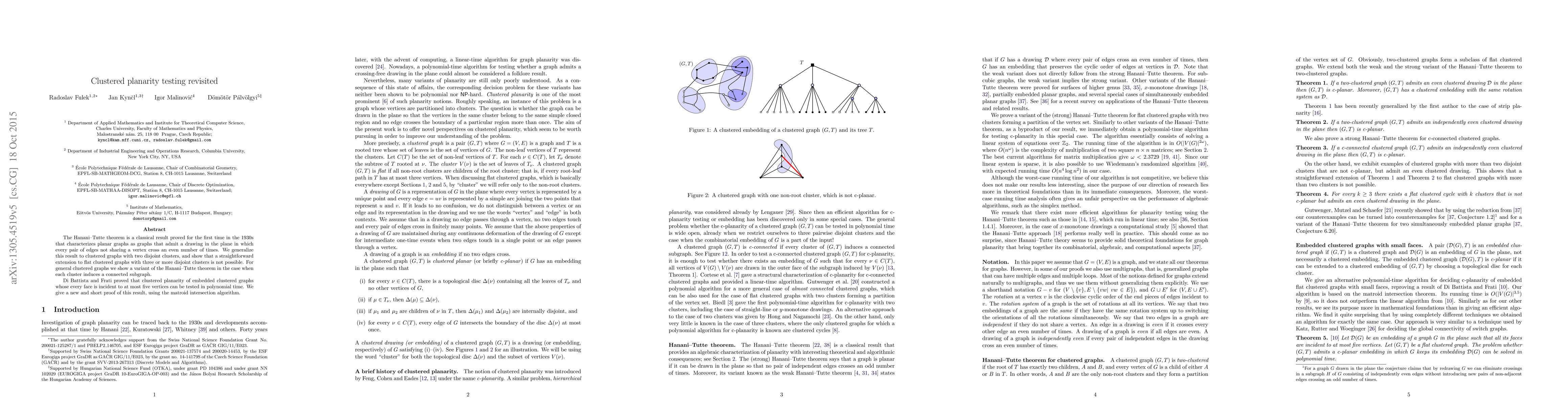 This paper generalizes the Hanani-Tutte theorem for planar graphs to clustered graphs with two disjoint clusters, proving that an extension to more clusters is not feasible. It provides a polynomial-time test for clustered planarity in graphs where each face has at most five vertices, using a matroid intersection algorithm.