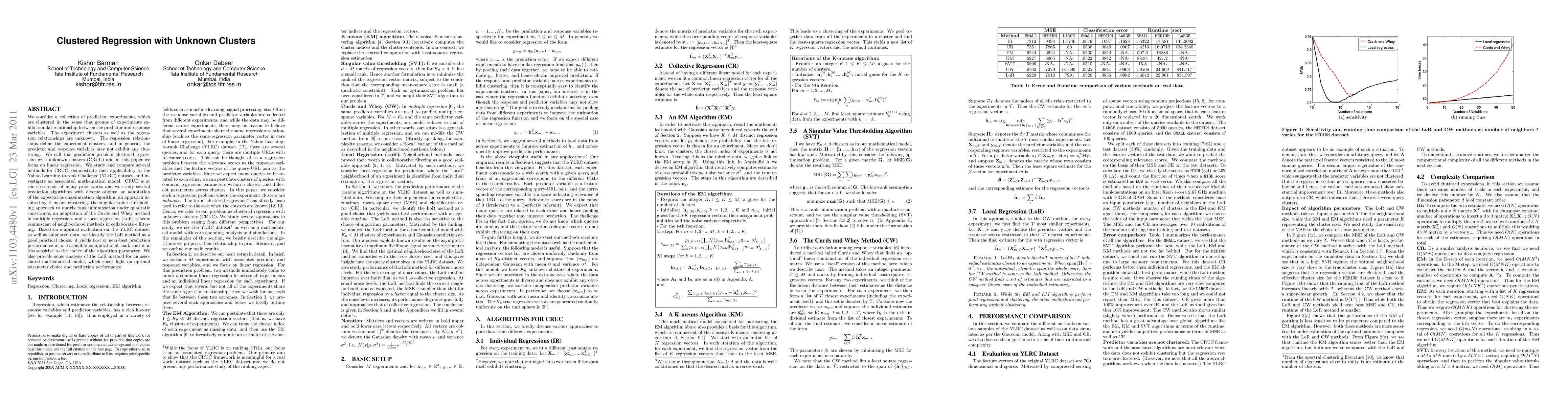 We consider a collection of prediction experiments, which are clustered in the sense that groups of experiments ex- hibit similar relationship between the predictor and response variables. The experiment clusters as well as the regres- sion relationships are unknown. The regression relation- ships define the experiment clusters, and in general, the predictor and response variables may not exhibit any clus- tering. We call this prediction problem clustered regres- sion with unknown clusters (CRUC) and in this paper we focus on linear regression. We study and compare several methods for CRUC, demonstrate their applicability to the Yahoo Learning-to-rank Challenge (YLRC) dataset, and in- vestigate an associated mathematical model. CRUC is at the crossroads of many prior works and we study several prediction algorithms with diverse origins: an adaptation of the expectation-maximization algorithm, an approach in- spired by K-means clustering, the singular value threshold- ing approach to matrix rank minimization under quadratic constraints, an adaptation of the Curds and Whey method in multiple regression, and a local regression (LoR) scheme reminiscent of neighborhood methods in collaborative filter- ing. Based on empirical evaluation on the YLRC dataset as well as simulated data, we identify the LoR method as a good practical choice: it yields best or near-best prediction performance at a reasonable computational load, and it is less sensitive to the choice of the algorithm parameter. We also provide some analysis of the LoR method for an asso- ciated mathematical model, which sheds light on optimal parameter choice and prediction performance.