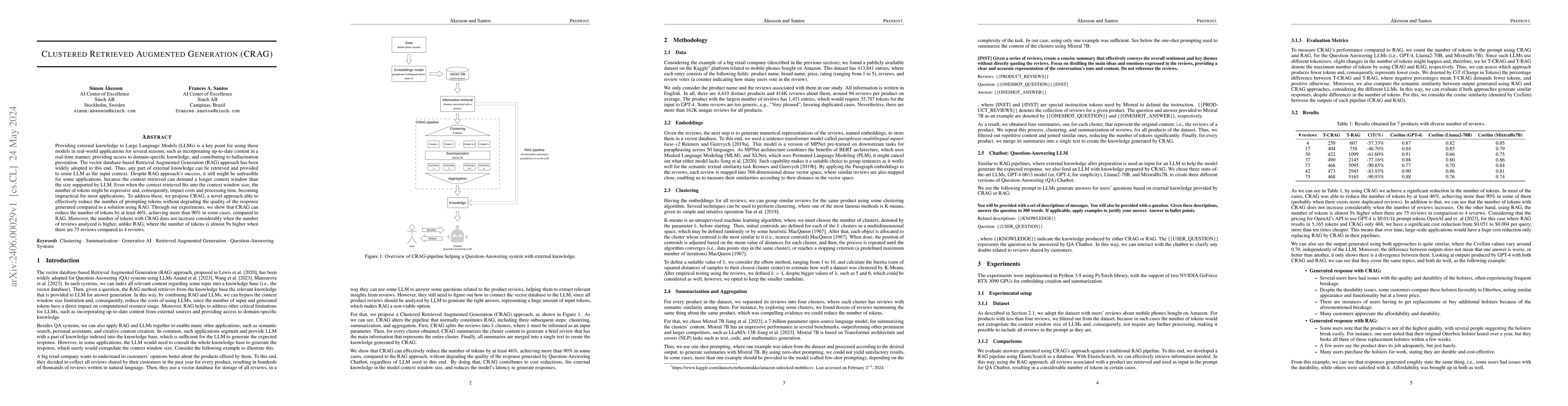 Providing external knowledge to Large Language Models (LLMs) is a key point for using these models in real-world applications for several reasons, such as incorporating up-to-date content in a real-time manner, providing access to domain-specific knowledge, and contributing to hallucination prevention. The vector database-based Retrieval Augmented Generation (RAG) approach has been widely adopted to this end. Thus, any part of external knowledge can be retrieved and provided to some LLM as the input context. Despite RAG approach's success, it still might be unfeasible for some applications, because the context retrieved can demand a longer context window than the size supported by LLM. Even when the context retrieved fits into the context window size, the number of tokens might be expressive and, consequently, impact costs and processing time, becoming impractical for most applications. To address these, we propose CRAG, a novel approach able to effectively reduce the number of prompting tokens without degrading the quality of the response generated compared to a solution using RAG. Through our experiments, we show that CRAG can reduce the number of tokens by at least 46\%, achieving more than 90\% in some cases, compared to RAG. Moreover, the number of tokens with CRAG does not increase considerably when the number of reviews analyzed is higher, unlike RAG, where the number of tokens is almost 9x higher when there are 75 reviews compared to 4 reviews.