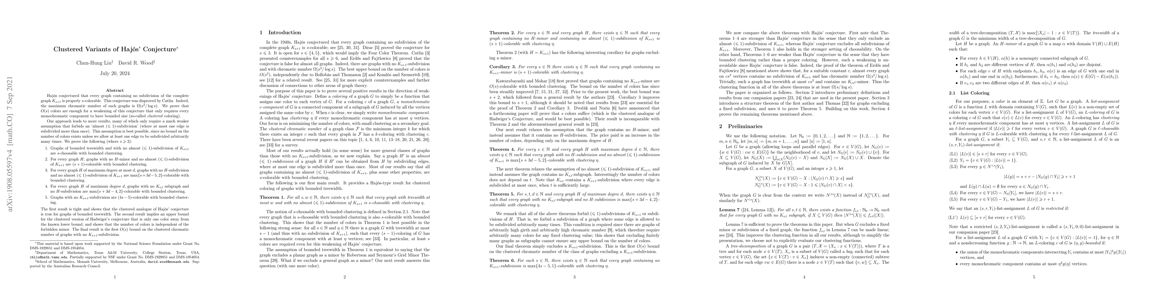 Haj\'os conjectured that every graph containing no subdivision of the complete graph $K_{s+1}$ is properly $s$-colorable. This conjecture was disproved by Catlin. Indeed, the maximum chromatic number of such graphs is $\Omega(s^2/\log s)$. We prove that $O(s)$ colors are enough for a weakening of this conjecture that only requires every monochromatic component to have bounded size (so-called clustered coloring). Our approach leads to more results. Say that a graph is an almost $(\leq 1)$-subdivision of a graph $H$ if it can be obtained from $H$ by subdividing edges, where at most one edge is subdivided more than once. Note that every graph with no $H$-subdivision does not contain an almost $(\leq 1)$-subdivision of $H$. We prove the following (where $s \geq 2$): (1) Graphs of bounded treewidth and with no almost $(\leq 1)$-subdivision of $K_{s+1}$ are $s$-choosable with bounded clustering. (2) For every graph $H$, graphs with no $H$-minor and no almost $(\leq 1)$-subdivision of $K_{s+1}$ are $(s+1)$-colorable with bounded clustering. (3) For every graph $H$ of maximum degree at most $d$, graphs with no $H$-subdivision and no almost $(\leq 1)$-subdivision of $K_{s+1}$ are $\max\{s+3d-5,2\}$-colorable with bounded clustering. (4) For every graph $H$ of maximum degree $d$, graphs with no $K_{s,t}$ subgraph and no $H$-subdivision are $\max\{s+3d-4,2\}$-colorable with bounded clustering. (5) Graphs with no $K_{s+1}$-subdivision are $(4s-5)$-colorable with bounded clustering. The first result shows that the weakening of Haj\'{o}s' conjecture is true for graphs of bounded treewidth in a stronger sense; the final result is the first $O(s)$ bound on the clustered chromatic number of graphs with no $K_{s+1}$-subdivision.