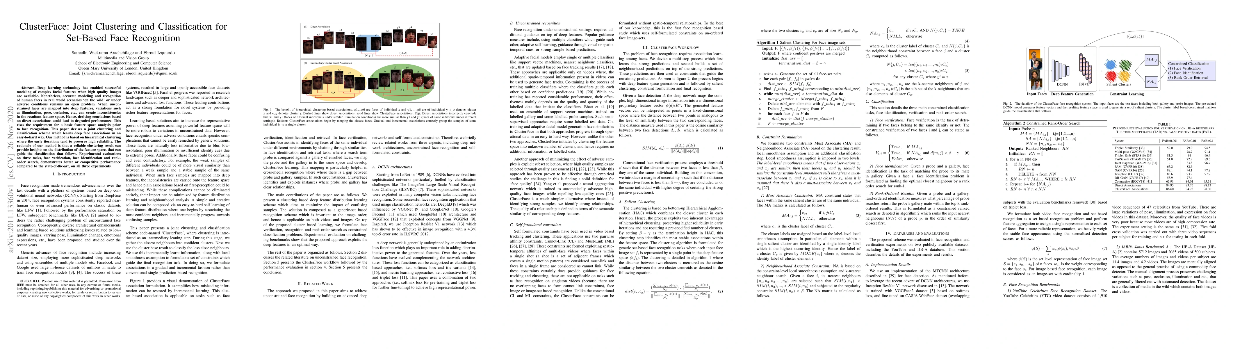 ClusterFace proposes a joint clustering and classification approach for set-based face recognition, addressing the challenges of real-world conditions. The method uses hierarchical clustering to analyze feature space and guide subsequent classification, achieving competitive performance in face verification, identification, and rank-order search.
