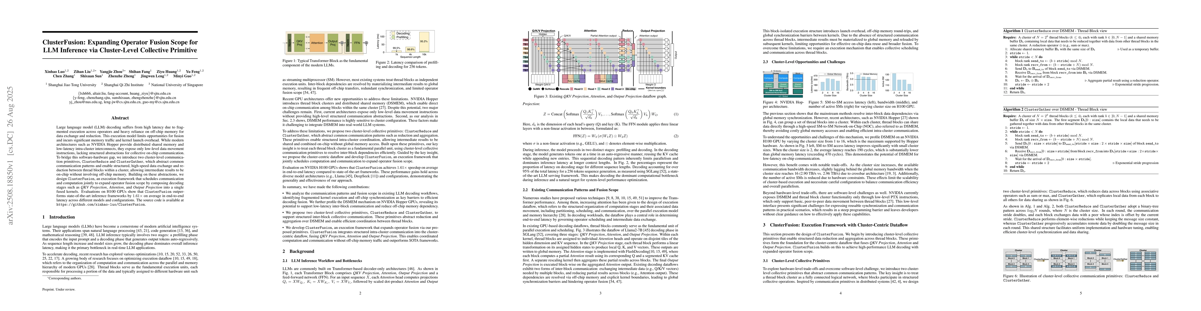 Large language model (LLM) decoding suffers from high latency due to fragmented execution across operators and heavy reliance on off-chip memory for data exchange and reduction. This execution model limits opportunities for fusion and incurs significant memory traffic and kernel launch overhead. While modern architectures such as NVIDIA Hopper provide distributed shared memory and low-latency intra-cluster interconnects, they expose only low-level data movement instructions, lacking structured abstractions for collective on-chip communication. To bridge this software-hardware gap, we introduce two cluster-level communication primitives, ClusterReduce and ClusterGather, which abstract common communication patterns and enable structured, high-speed data exchange and reduction between thread blocks within a cluster, allowing intermediate results to be on-chip without involving off-chip memory. Building on these abstractions, we design ClusterFusion, an execution framework that schedules communication and computation jointly to expand operator fusion scope by composing decoding stages such as QKV Projection, Attention, and Output Projection into a single fused kernels. Evaluations on H100 GPUs show that ClusterFusion outperforms state-of-the-art inference frameworks by 1.61x on average in end-to-end latency across different models and configurations. The source code is available at https://github.com/xinhao-luo/ClusterFusion.