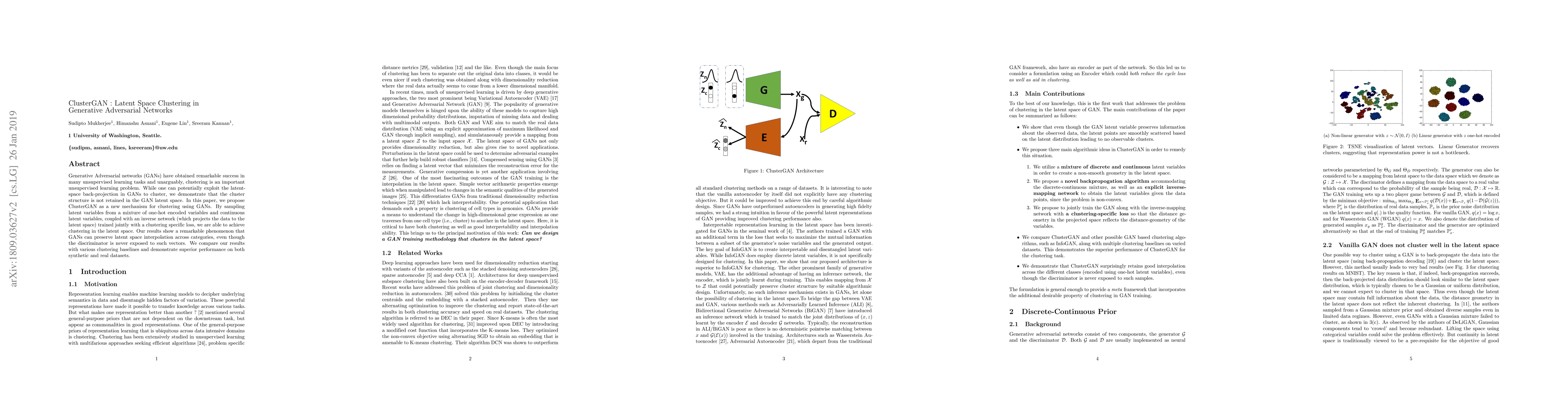 ClusterGAN introduces a novel mechanism for latent space clustering in GANs by combining one-hot encoded variables with continuous latent variables and an inverse network trained with a clustering-specific loss. This approach enables effective clustering in the GAN latent space, demonstrating superior performance compared to various baselines on both synthetic and real datasets.