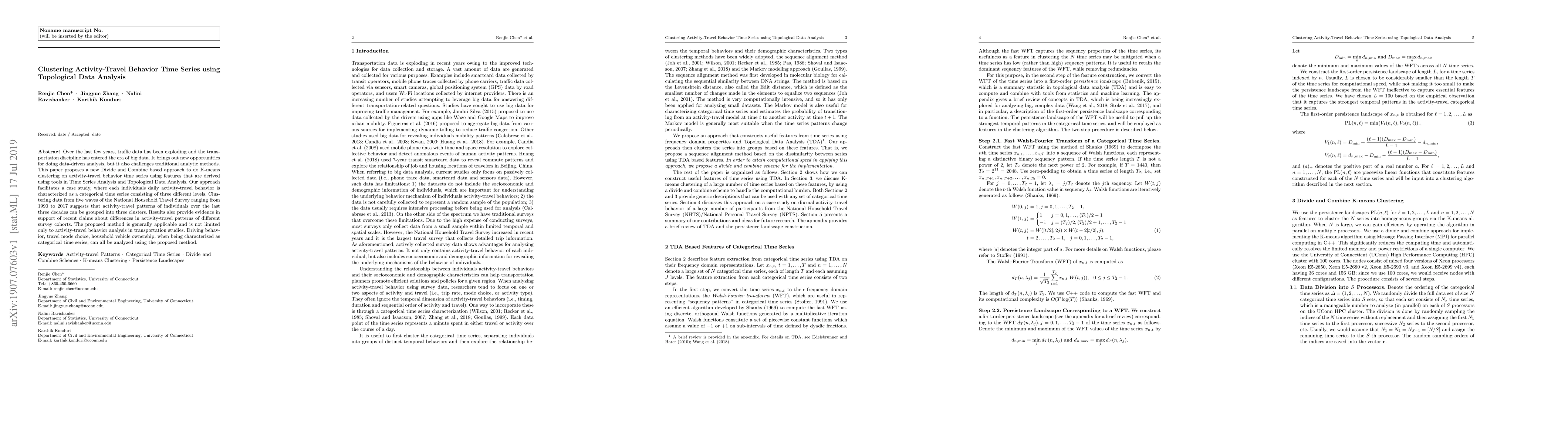 This paper introduces a novel clustering method for activity-travel behavior time series using topological data analysis, revealing three distinct activity-travel patterns from survey data spanning 1990 to 2017. The proposed approach is versatile and applicable beyond transportation studies, including analysis of driving behavior and travel mode choice.