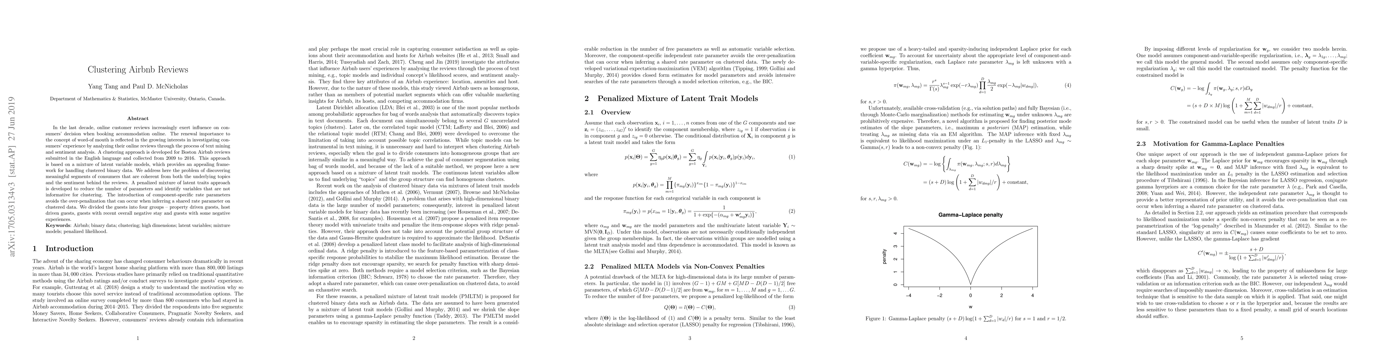 In the last decade, online customer reviews increasingly exert influence on consumers' decision when booking accommodation online. The renewal importance to the concept of word-of mouth is reflected in the growing interests in investigating consumers' experience by analyzing their online reviews through the process of text mining and sentiment analysis. A clustering approach is developed for Boston Airbnb reviews submitted in the English language and collected from 2009 to 2016. This approach is based on a mixture of latent variable models, which provides an appealing framework for handling clustered binary data. We address here the problem of discovering meaningful segments of consumers that are coherent from both the underlying topics and the sentiment behind the reviews. A penalized mixture of latent traits approach is developed to reduce the number of parameters and identify variables that are not informative for clustering. The introduction of component-specific rate parameters avoids the over-penalization that can occur when inferring a shared rate parameter on clustered data. We divided the guests into four groups -- property driven guests, host driven guests, guests with recent overall negative stay and guests with some negative experiences.