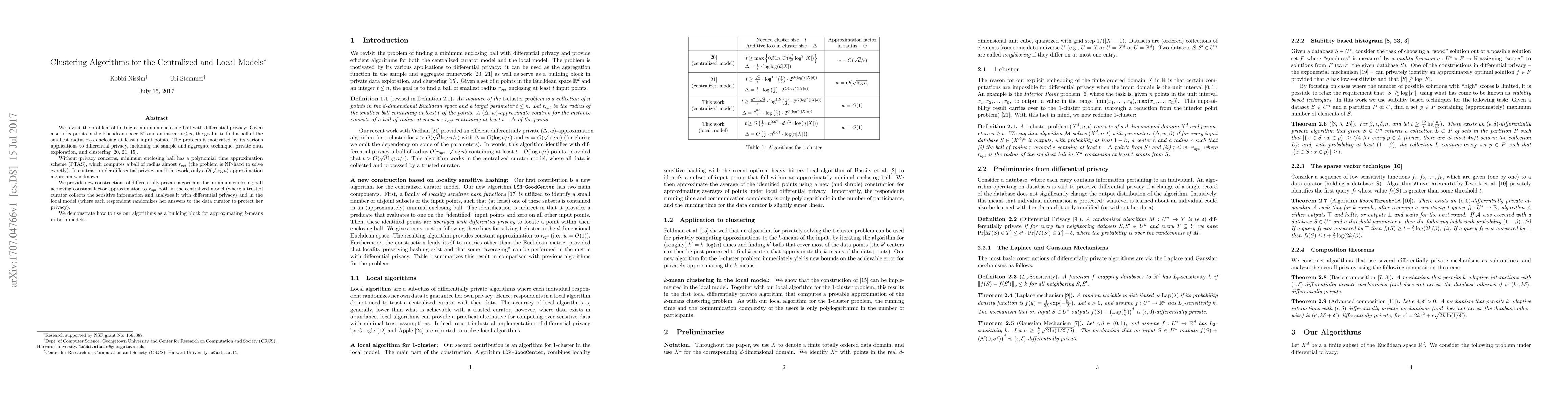 We revisit the problem of finding a minimum enclosing ball with differential privacy: Given a set of $n$ points in the Euclidean space $\mathbb{R}^d$ and an integer $t\leq n$, the goal is to find a ball of the smallest radius $r_{opt}$ enclosing at least $t$ input points. The problem is motivated by its various applications to differential privacy, including the sample and aggregate technique, private data exploration, and clustering. Without privacy concerns, minimum enclosing ball has a polynomial time approximation scheme (PTAS), which computes a ball of radius almost $r_{opt}$ (the problem is NP-hard to solve exactly). In contrast, under differential privacy, until this work, only a $O(\sqrt{\log n})$-approximation algorithm was known. We provide new constructions of differentially private algorithms for minimum enclosing ball achieving constant factor approximation to $r_{opt}$ both in the centralized model (where a trusted curator collects the sensitive information and analyzes it with differential privacy) and in the local model (where each respondent randomizes her answers to the data curator to protect her privacy). We demonstrate how to use our algorithms as a building block for approximating $k$-means in both models.