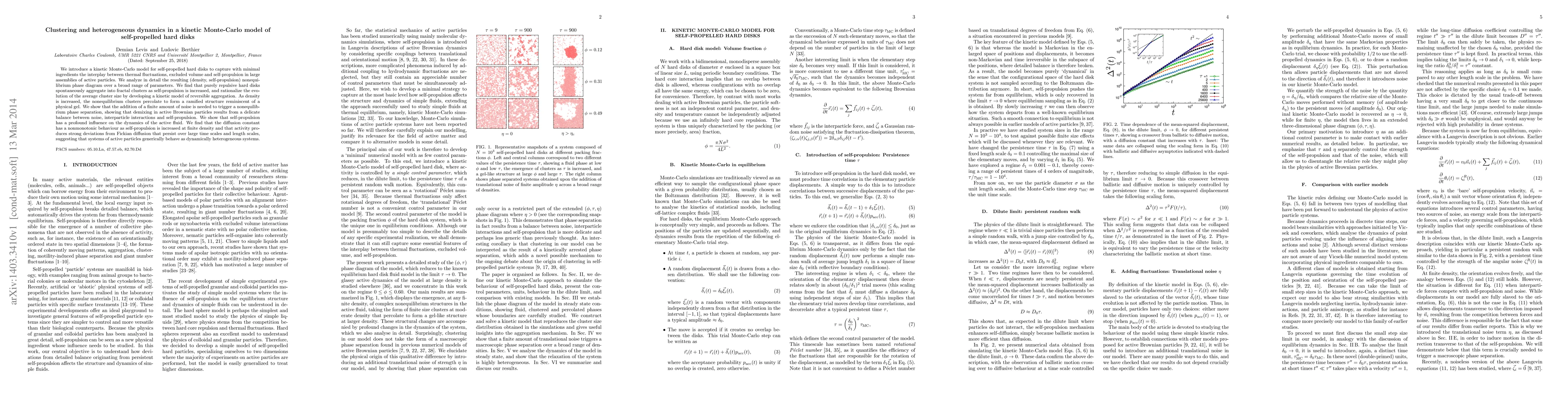 We introduce a kinetic Monte-Carlo model for self-propelled hard disks to capture with minimal ingredients the interplay between thermal fluctuations, excluded volume and self-propulsion in large assemblies of active particles. We analyze in detail the resulting (density, self-propulsion) nonequilibrium phase diagram over a broad range of parameters. We find that purely repulsive hard disks spontaneously aggregate into fractal clusters as self-propulsion is increased, and rationalize the evolution of the average cluster size by developing a kinetic model of reversible aggregation. As density is increased, the nonequilibrium clusters percolate to form a ramified structure reminiscent of a physical gel. We show that the addition of a finite amount of noise is needed to trigger a nonequilibrium phase separation, showing that demixing in active Brownian particles results from a delicate balance between noise, interparticle interactions and self-propulsion. We show that self-propulsion has a profound influence on the dynamics of the active fluid. We find that the diffusion constant has a nonmonotonic behaviour as self-propulsion is increased at finite density and that activity produces strong deviations from Fickian diffusion that persist over large time scales and length scales, suggesting that systems of active particles generically behave as dynamically heterogeneous systems.
