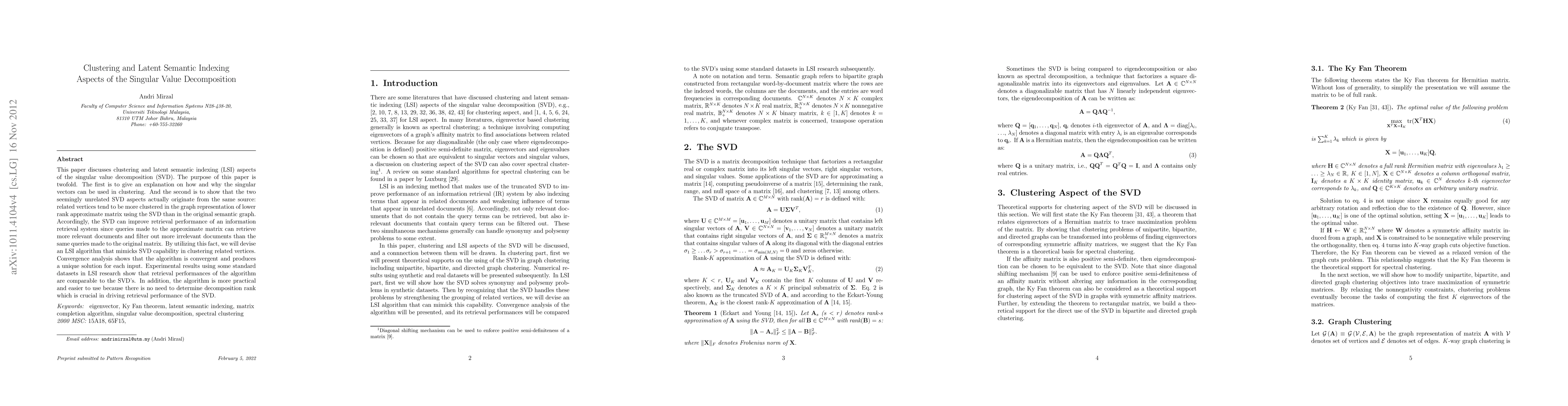 This paper discusses clustering and latent semantic indexing (LSI) aspects of the singular value decomposition (SVD). The purpose of this paper is twofold. The first is to give an explanation on how and why the singular vectors can be used in clustering. And the second is to show that the two seemingly unrelated SVD aspects actually originate from the same source: related vertices tend to be more clustered in the graph representation of lower rank approximate matrix using the SVD than in the original semantic graph. Accordingly, the SVD can improve retrieval performance of an information retrieval system since queries made to the approximate matrix can retrieve more relevant documents and filter out more irrelevant documents than the same queries made to the original matrix. By utilizing this fact, we will devise an LSI algorithm that mimicks SVD capability in clustering related vertices. Convergence analysis shows that the algorithm is convergent and produces a unique solution for each input. Experimental results using some standard datasets in LSI research show that retrieval performances of the algorithm are comparable to the SVD's. In addition, the algorithm is more practical and easier to use because there is no need to determine decomposition rank which is crucial in driving retrieval performance of the SVD.